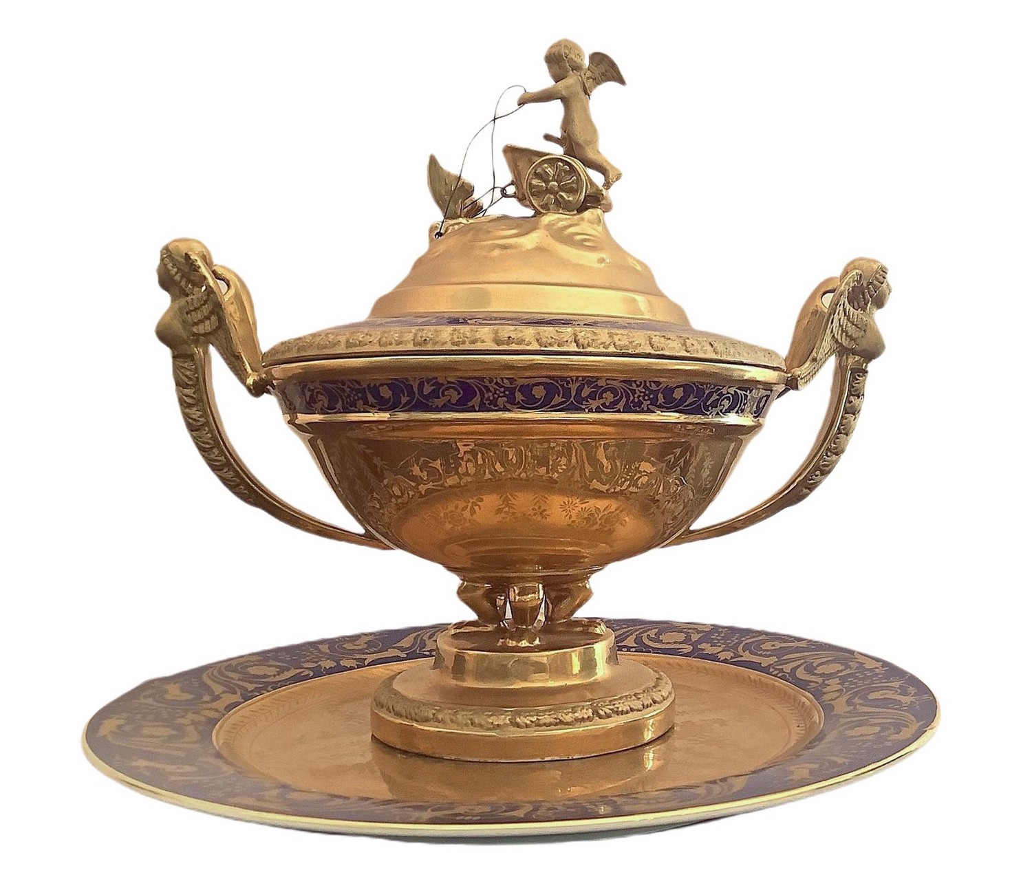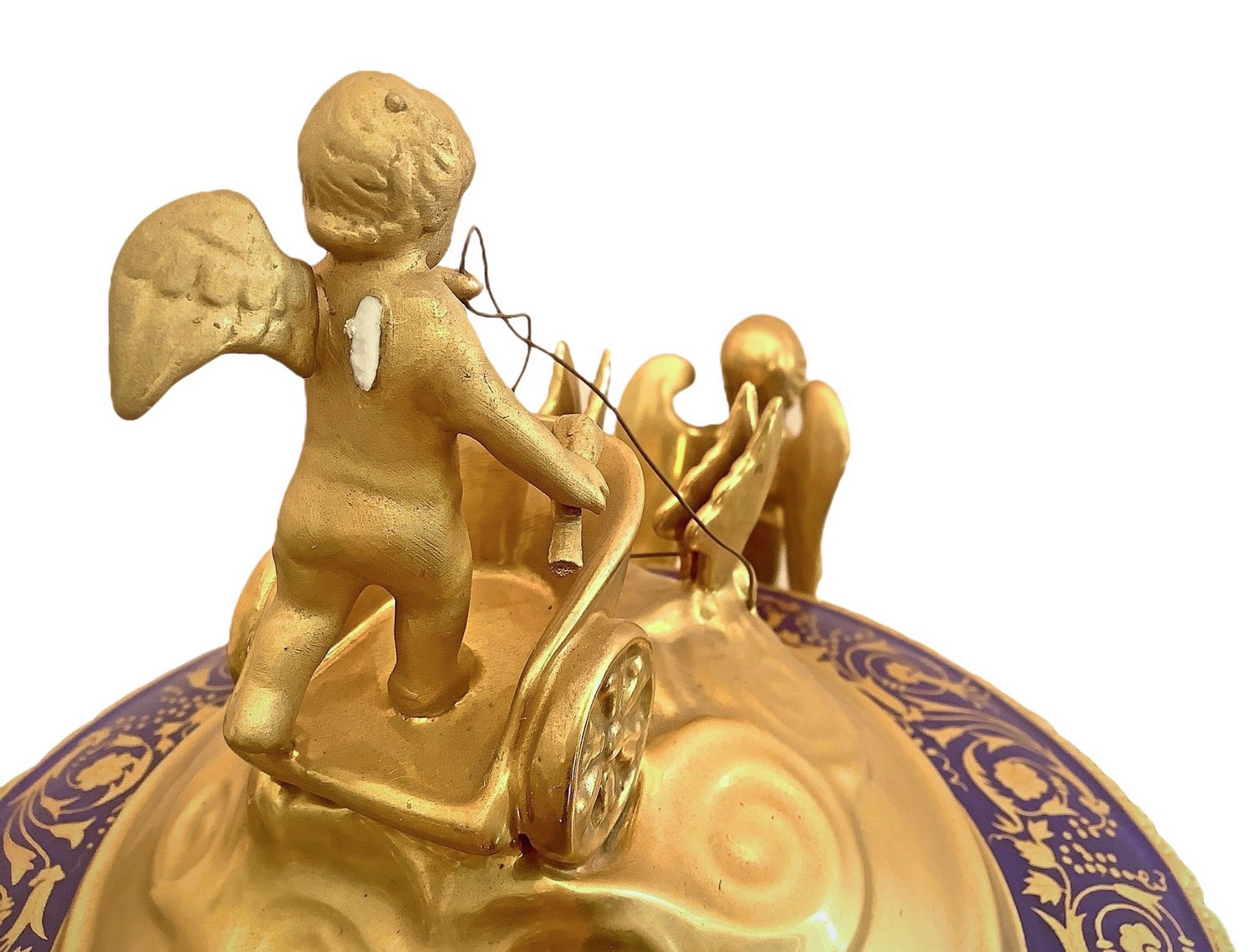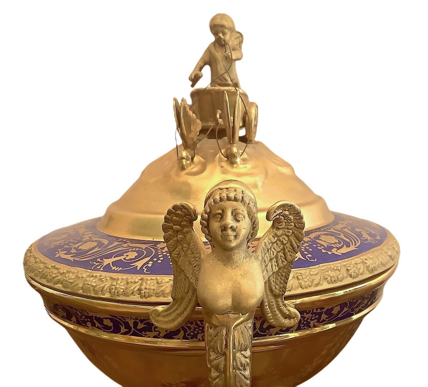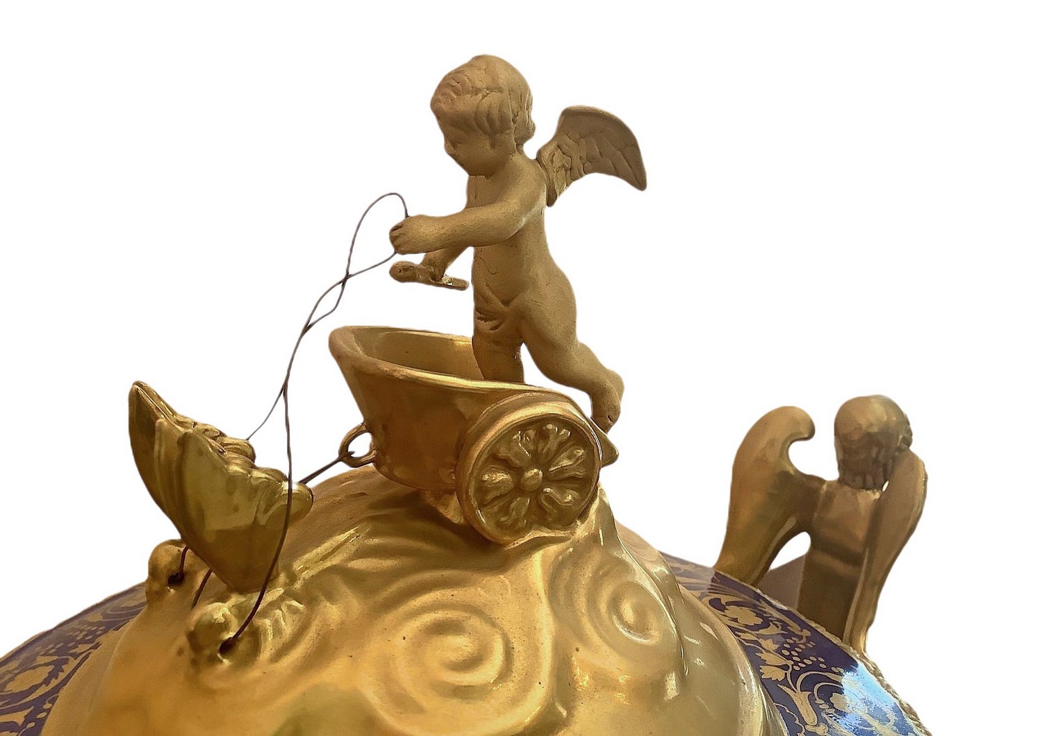 Poutiche con coperchio con presa ad amorino e piatto alla base. In porcellana fondo blu, con dorature al mercurio. Mancanze all'ala del cupido H cm 30, piatto Diametro cm 31