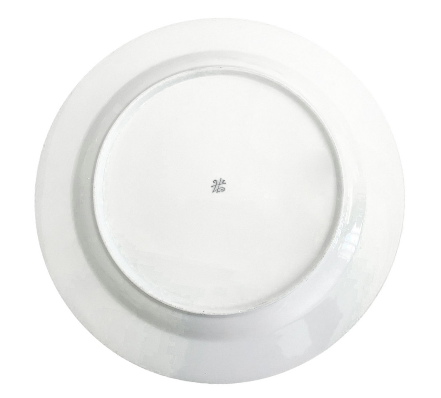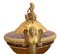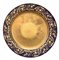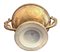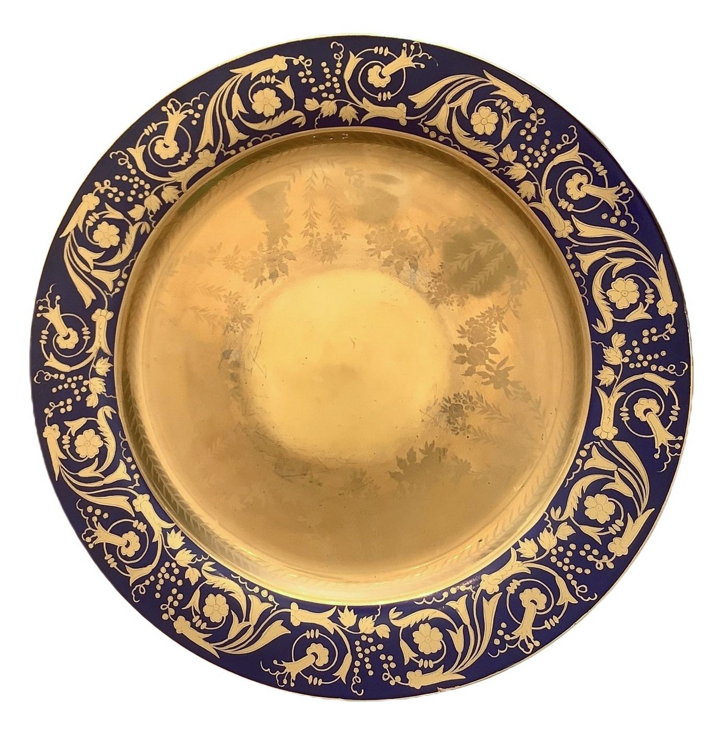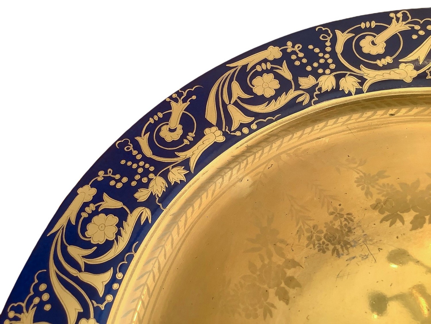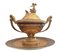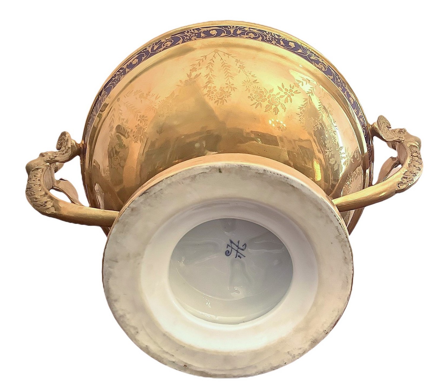 Poutiche con coperchio con presa ad amorino e piatto alla base. In porcellana fondo blu, con dorature al mercurio. Mancanze all'ala del cupido H cm 30, piatto Diametro cm 31