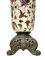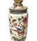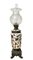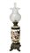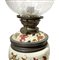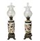 Coppia di lumi in maiolica. Boccia in vetro a tulipano, base in bronzo e decorazioni di fiori e uccelli XX secolo H 65 cm