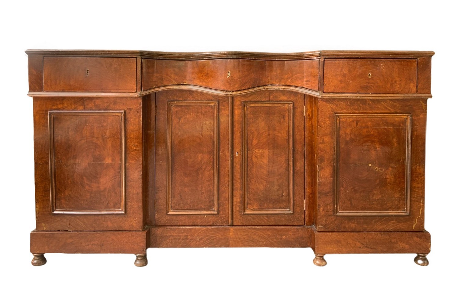 Credenza bassa in legno di mogano a due corpi. Due sportelli laterali più due centrali. Piede a cipolla piatto e tre cassetti nel corpo superiore. H cm 104x190x55. H 104x190x55 cm XIX secolo