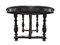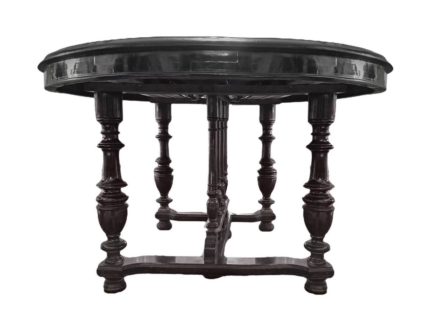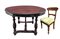 Tavolo rotondo in mogano allungabile con quattro sedie e allunghi di servizio.