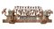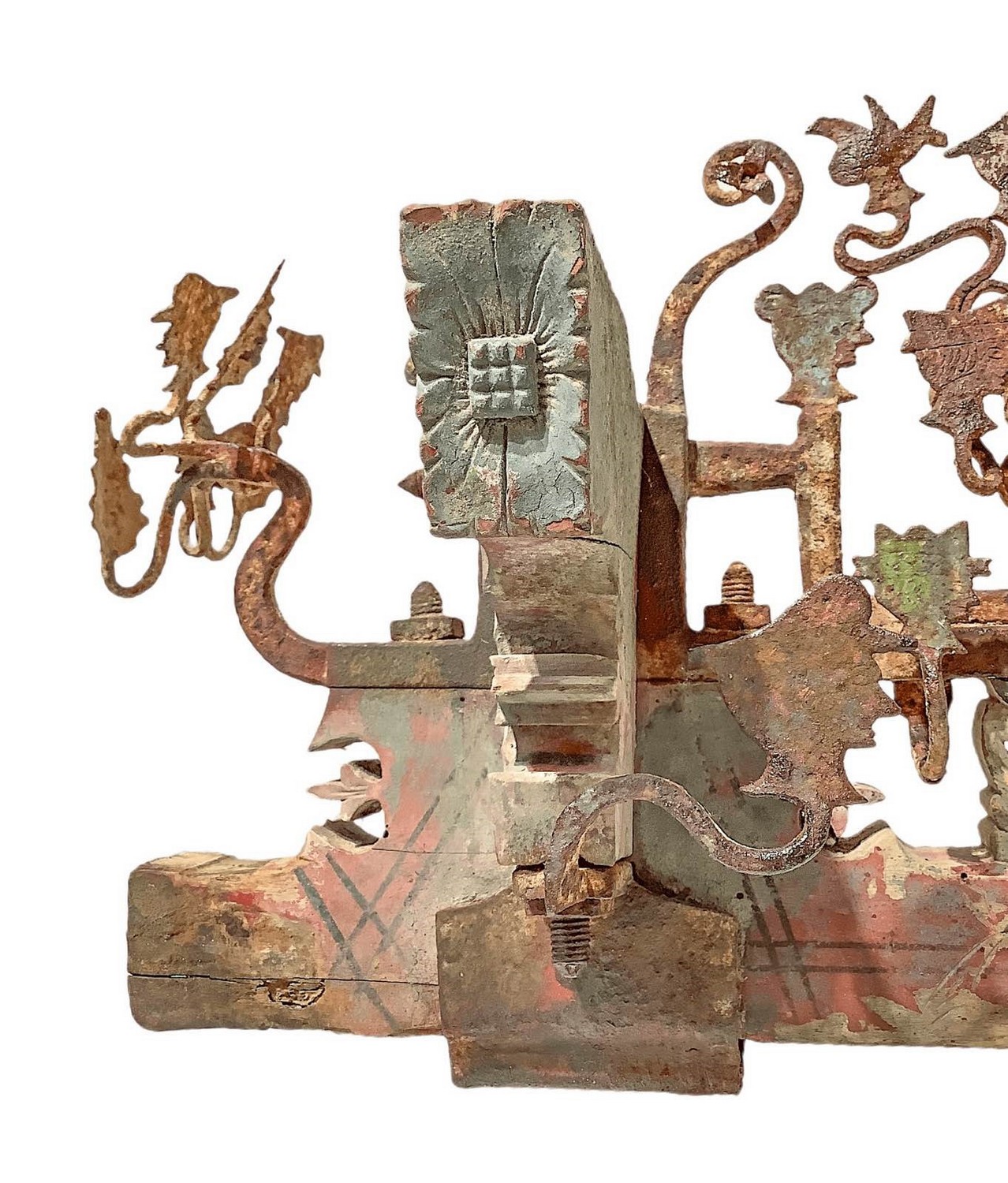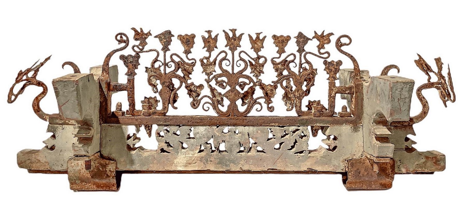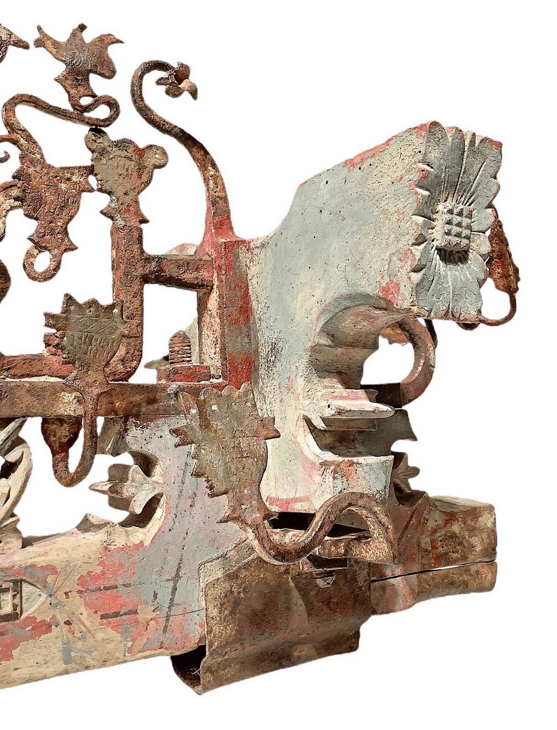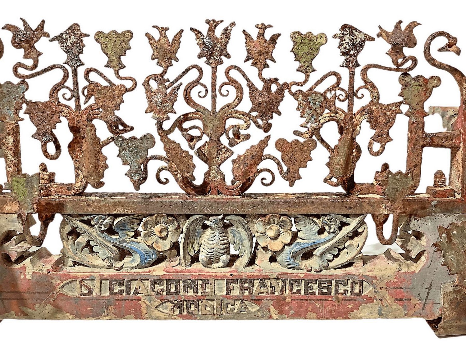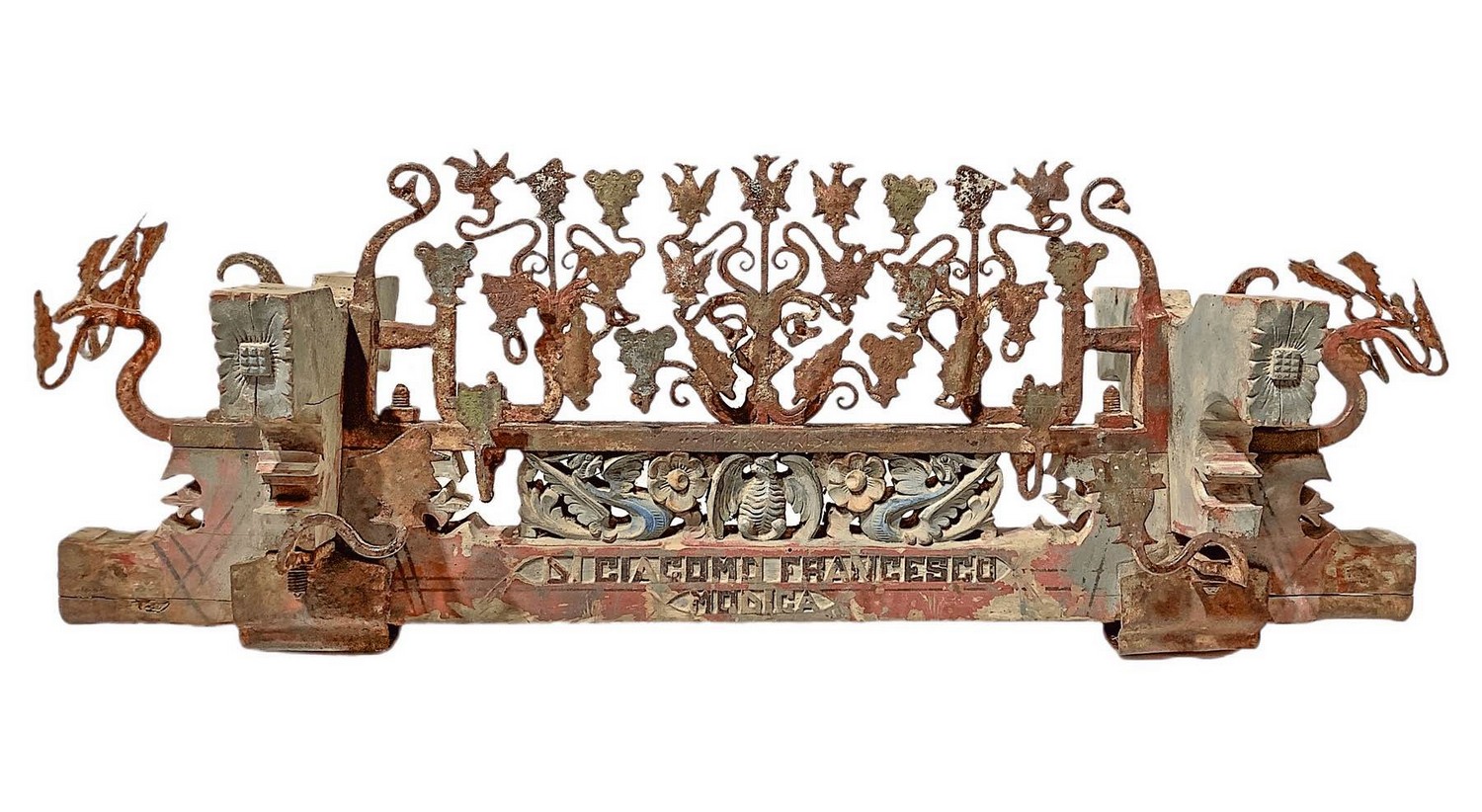 Frammento di carretto, cascia di fuso, autore Di Giacomo Francesco, Modica, Catania, Sicilia.. In legno policromo scolpito a putti, mascheroni e ferro battuto alla forgia in stile barocco con teste di paladini con elmo eaquile, H cm 40x100 XX secolo.