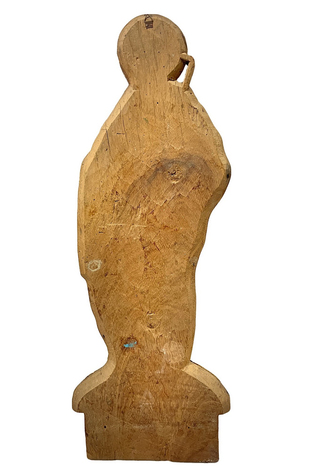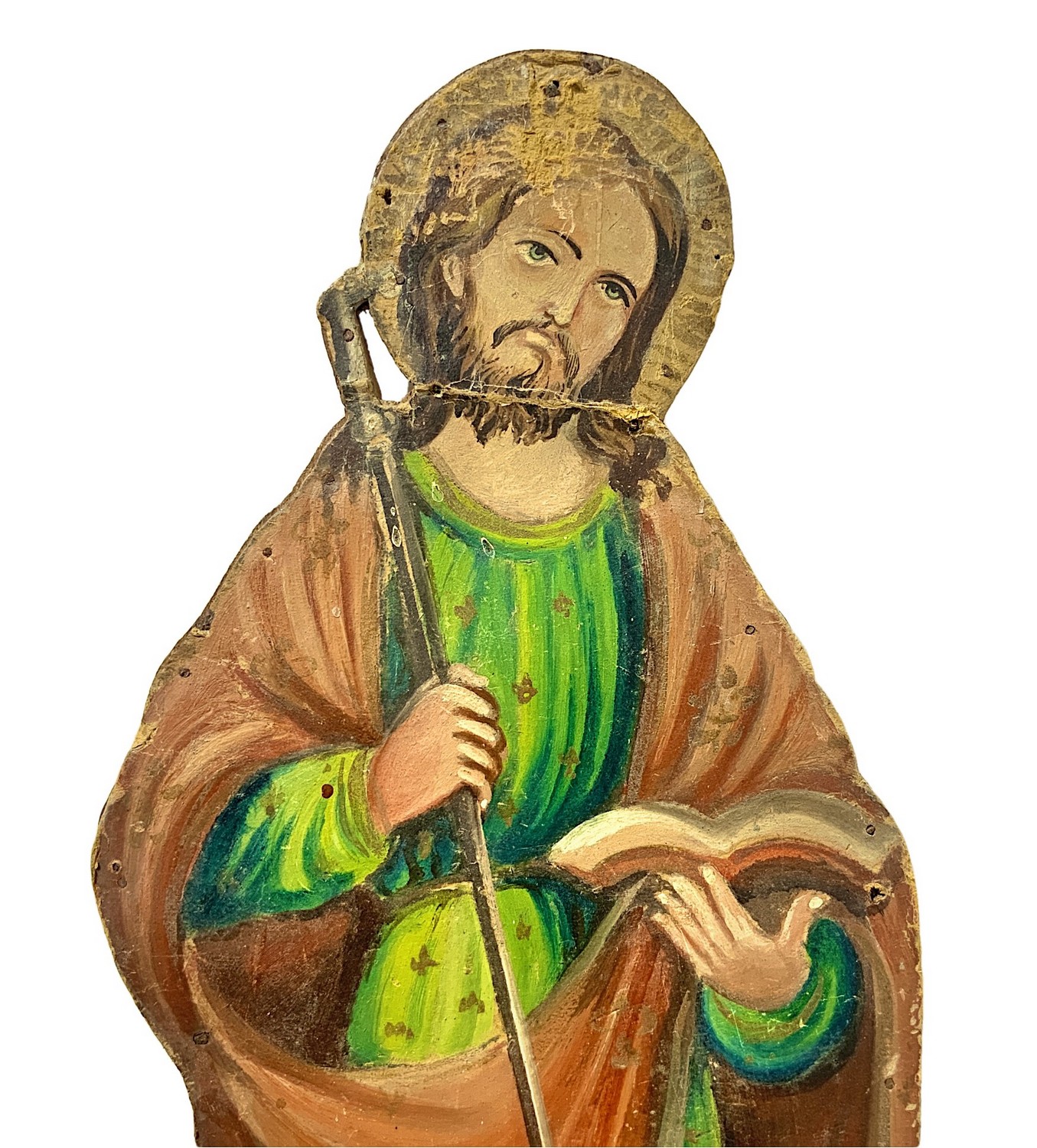 Figurazione di apostolo, San Giacomo.. Tempera su cartone applicato a legno H 69 cm XIX secolo