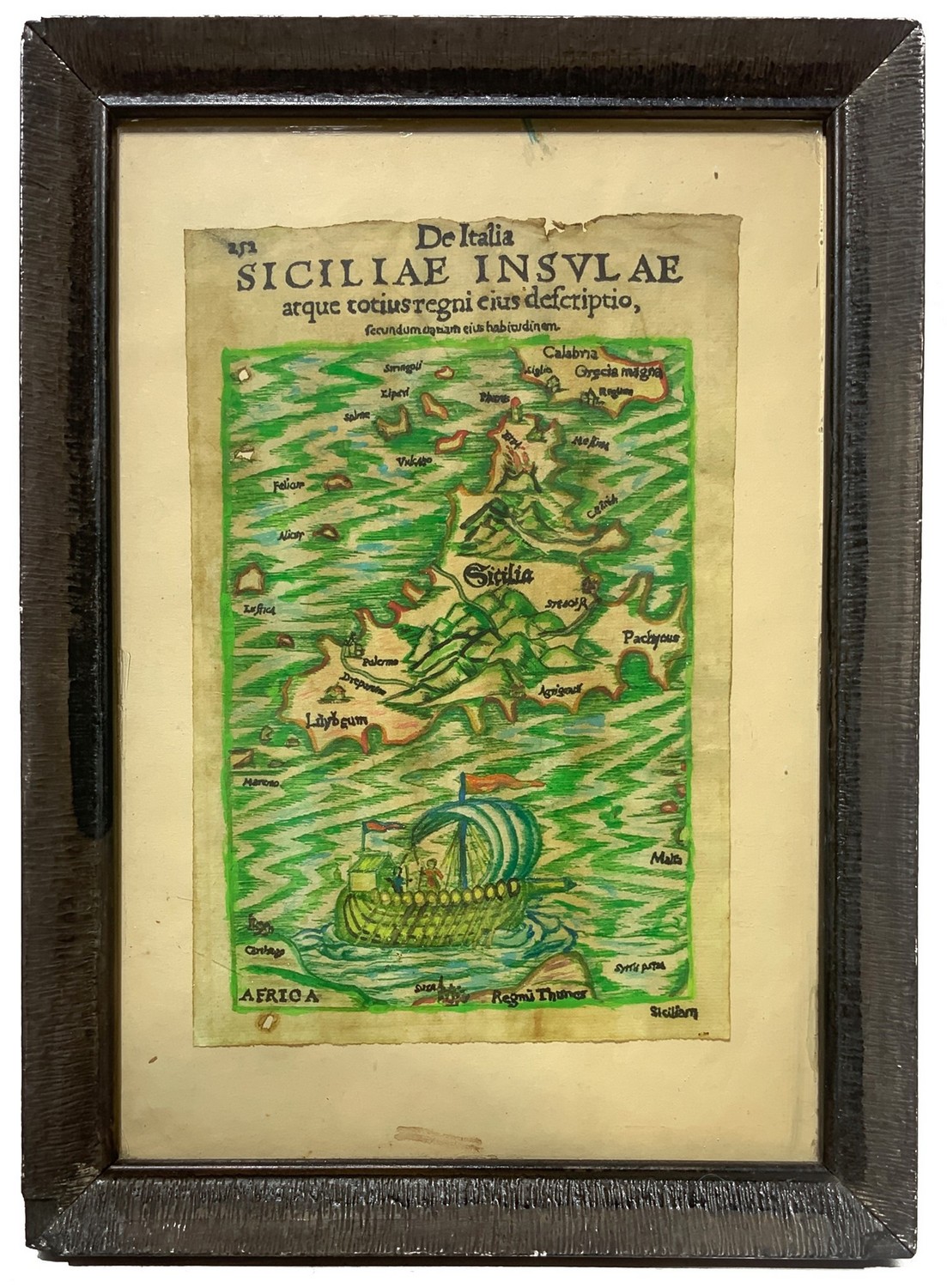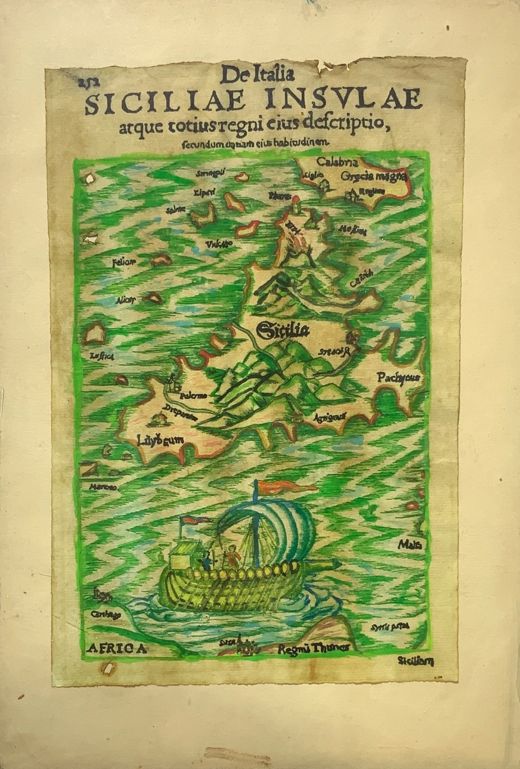De Italia Siciliae Insulae, atque totius regni eius descriptio. Munster Sebastian (1489-1552) Stampa su carta 24x16 cm