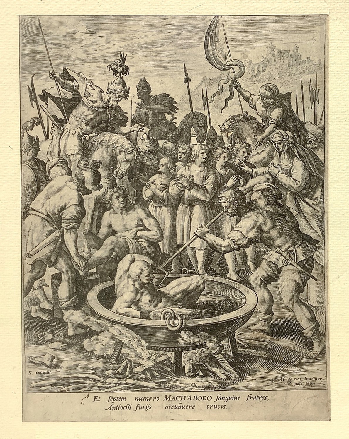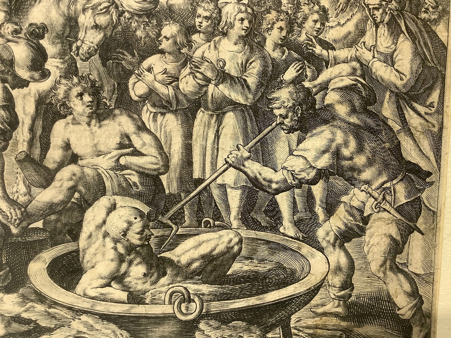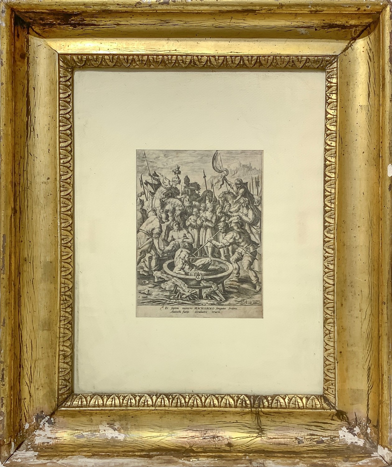 Martirio di San Lorenzo. Incisione su carta M.De Vos inventore, scultore C.de Pajs 197x145 mm, in cornice a mezza canna siciliana del XIX secolo 50x42 cm XVII secolo