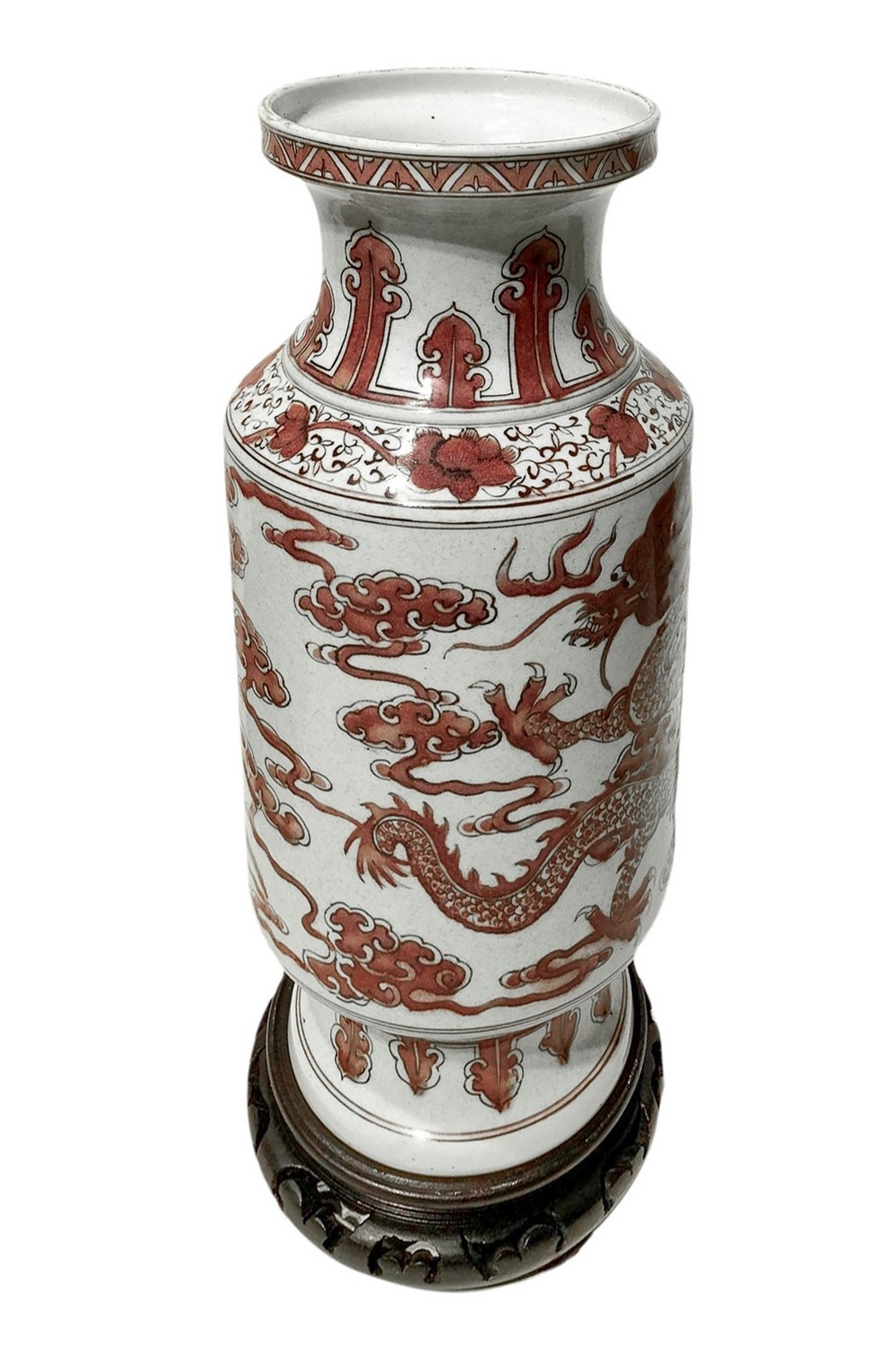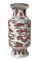 Vaso in ceramica con decorazione di draghi e fenici. Nei toni del rosa e base in legno. Dinastia Qing, periodo Guangxu