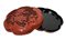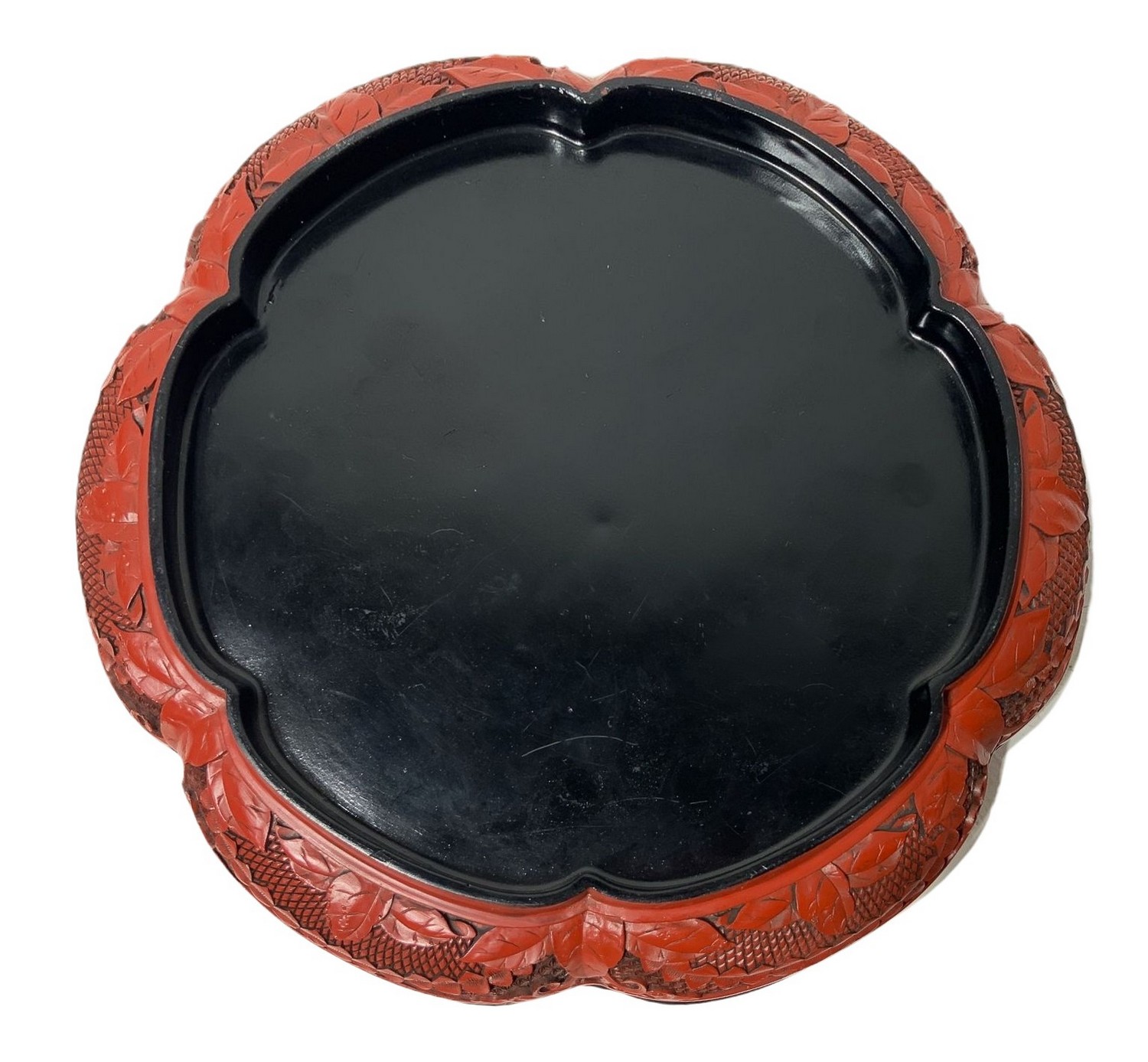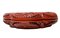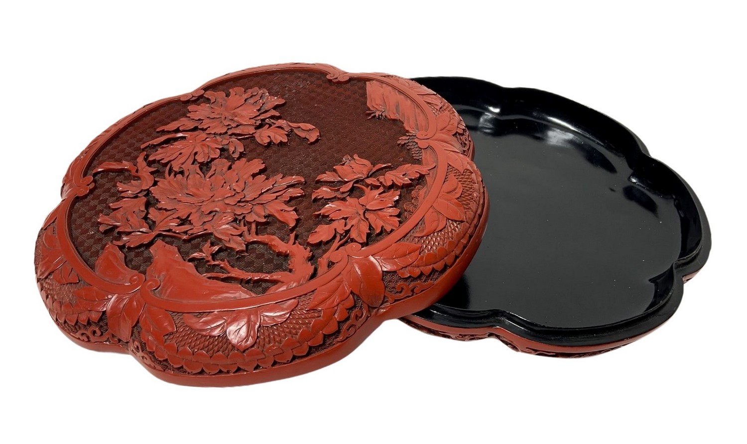 Scatola laccata in rosso cinabro. Decorazione floreale a basso rilievo.. Diametro 25 cm, h cm 5,5