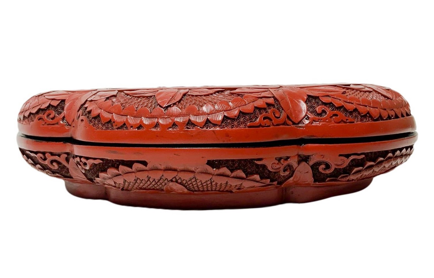 Scatola laccata in rosso cinabro. Decorazione floreale a basso rilievo.