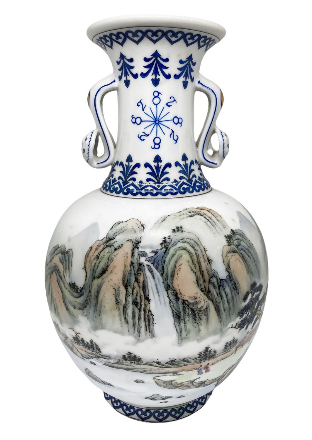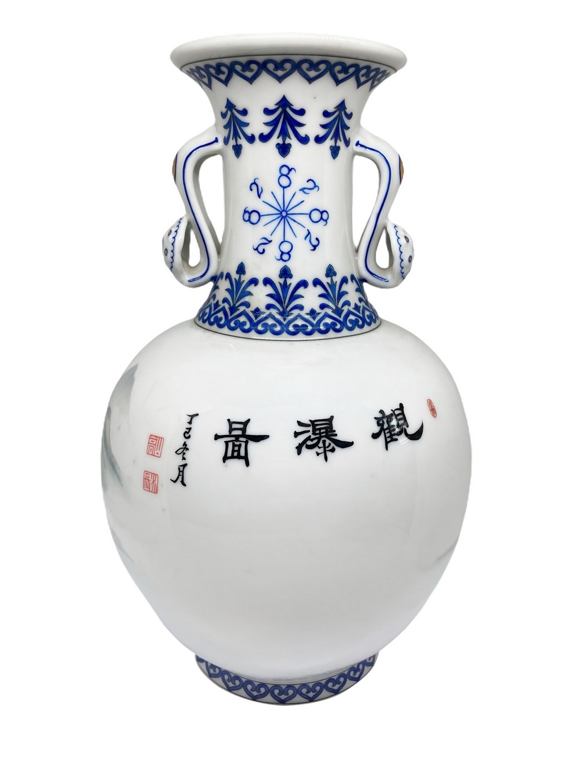 Vaso cinese biansato a fondo bianco, decorato nei toni del blu. Rappresentazione di paesaggio di montagna sul fronte 31 cm