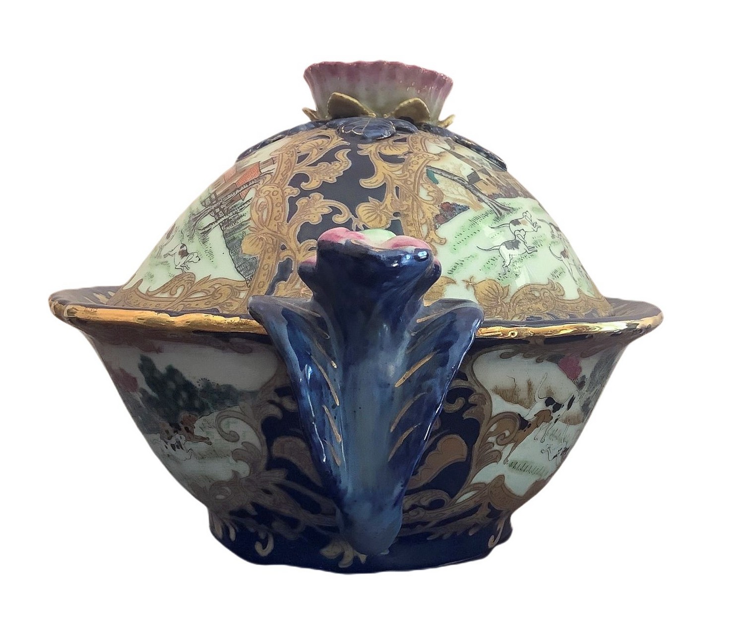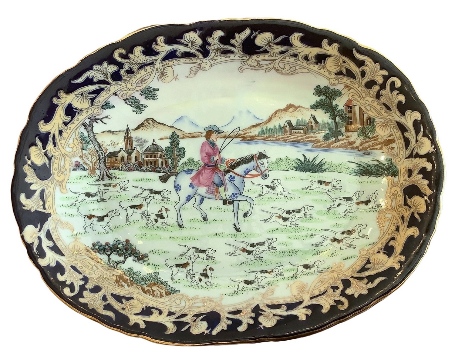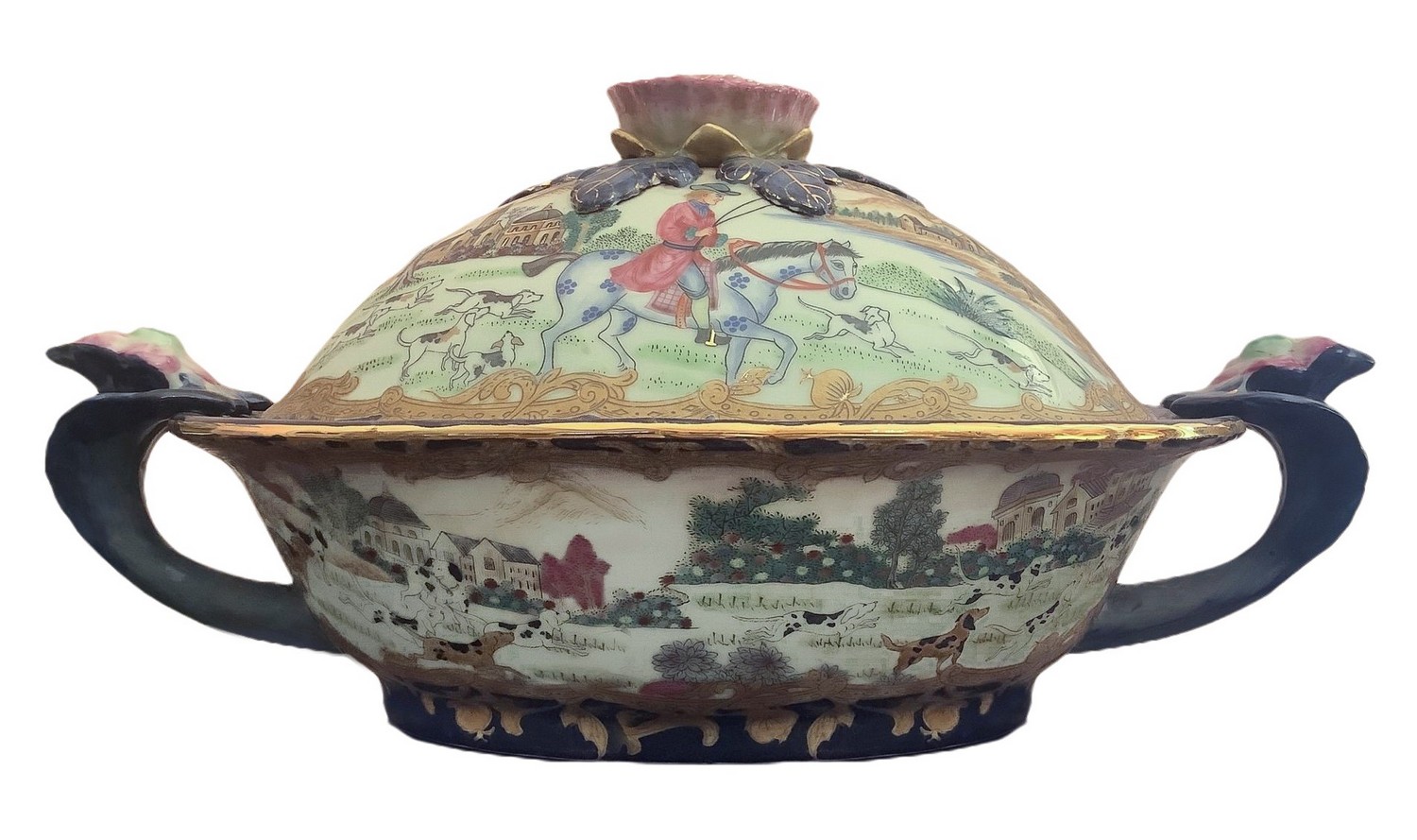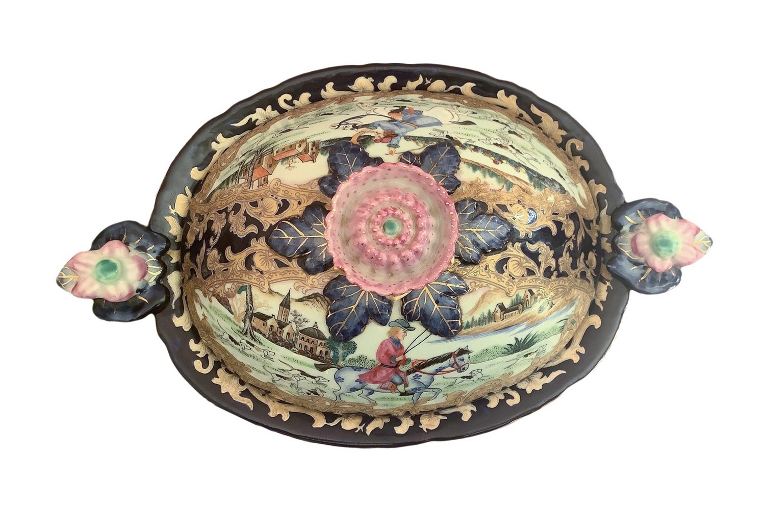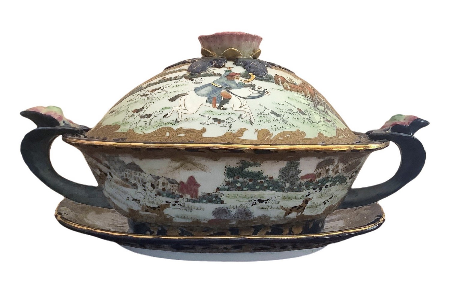 Zuppiera in porcellana con coperchio e piatto. . Policroma con paesaggio e cavaliere, particolari in oro e presa con decorazione floreale. H 21x40 cm, piatto 34x26 cm