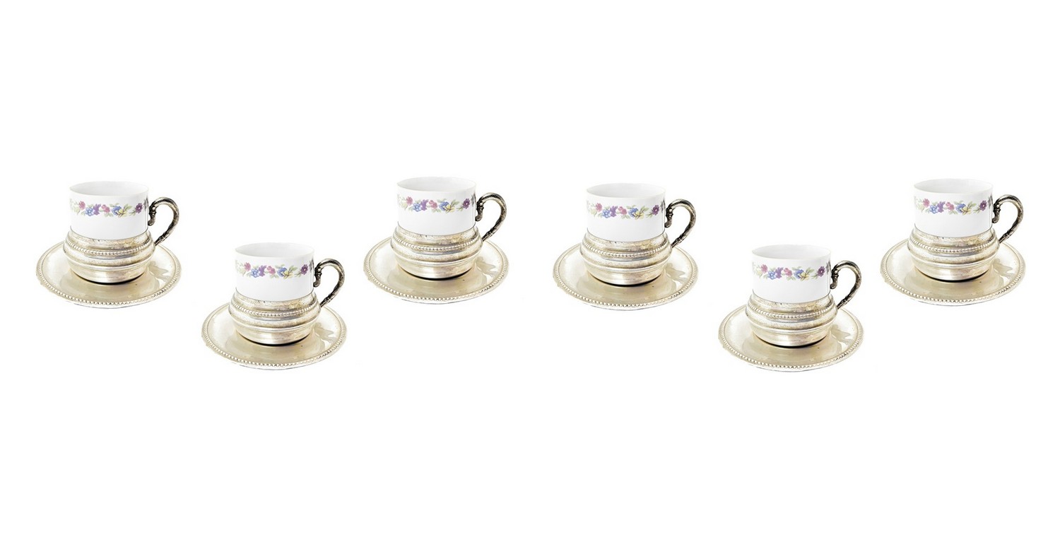 Servizio da caffè composto da n. 6 tazze in porcellana di Capodimonte.. Con manico, sottotazza e piattino in argento, Palermo, inizi XX secolo.