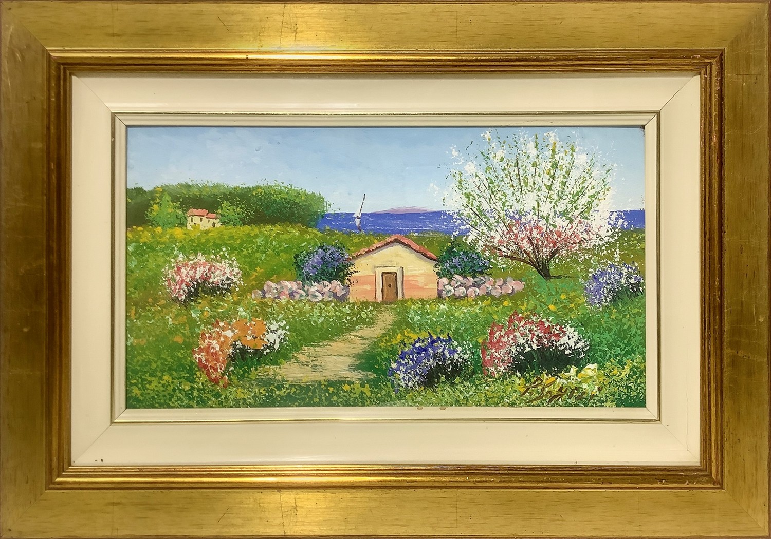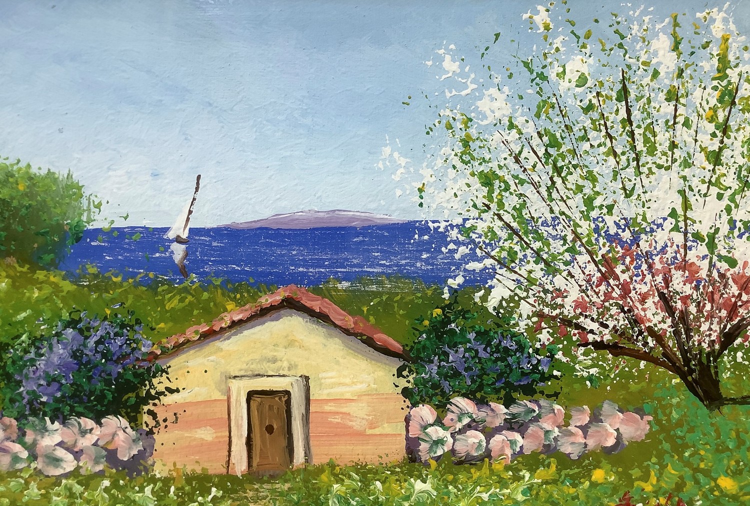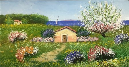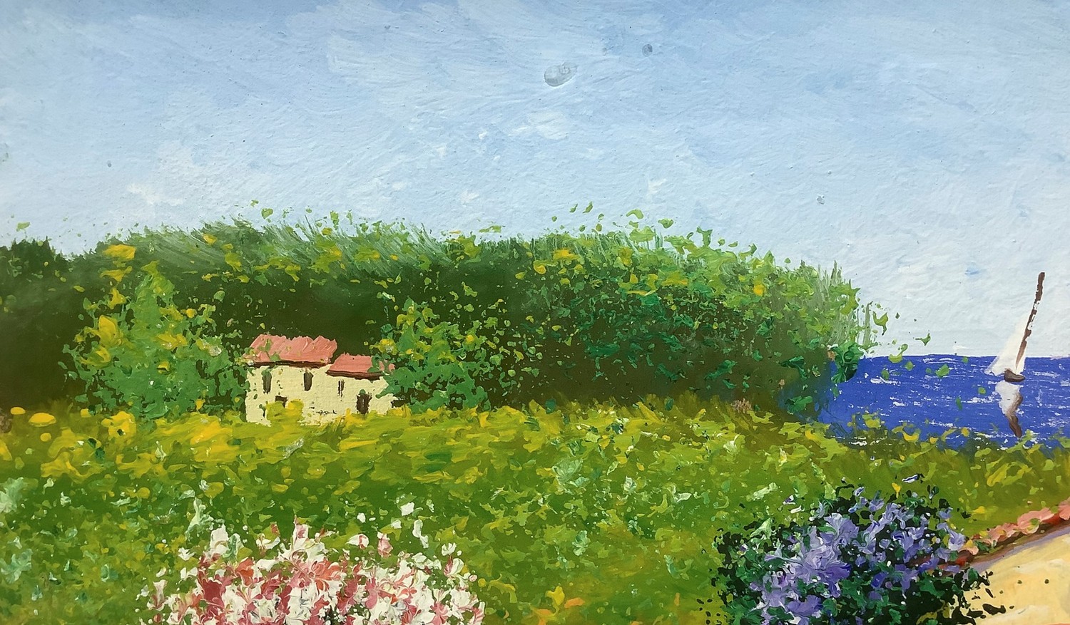 Casa con alberi e mare. firmato PierpaoloSoffici Olio su masonite 25x46 cm, in cornice 45x66 cm Pierpaolo Soffici 1964