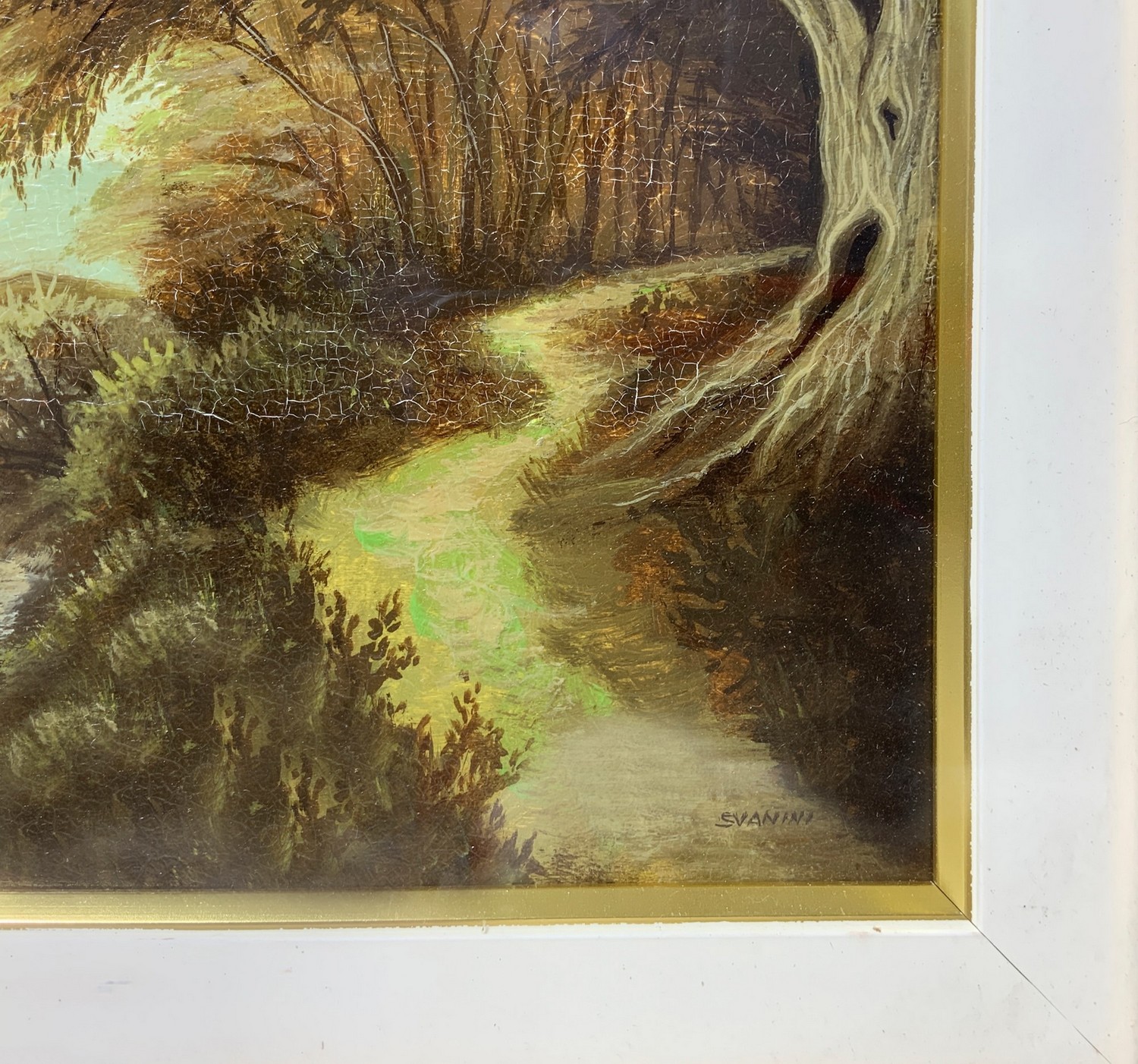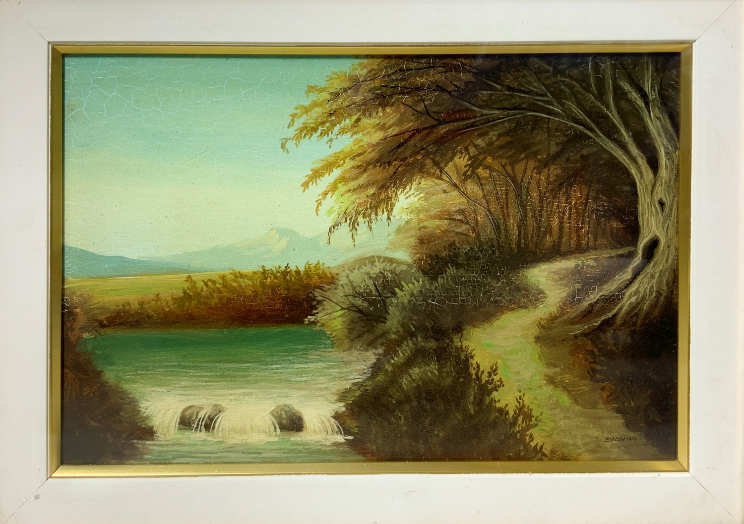 Paesaggio con fiume. Firmato in basso a destra, autore Svanini Dipinto a olio su tavola 20x30 cm, in cornice 40x50 cm