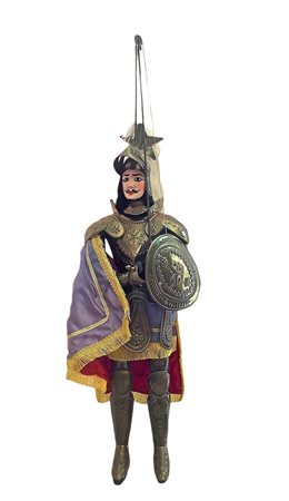 Opera artigianale di uno dei più grandi pupari siciliani, Salvatore Faro, “u Lumaru” (Catania, 1921-1970). Impresario che gestì il proprio Teatro di Via Carlo Forlanini a Catania nel quale, durante gli spettacoli, svolgeva anche il ruolo di Parraturi e di Maniante dei pupi. Disegnava e dipingeva i Cartelloni per gli spettacoli serali e costruiva i relativi “pupi” da “Combattimento” e da “Mini-combattimento”. E’ ricordato come celebre maestro di una stirpe di Pupari.