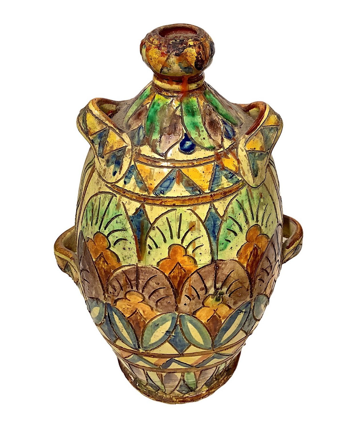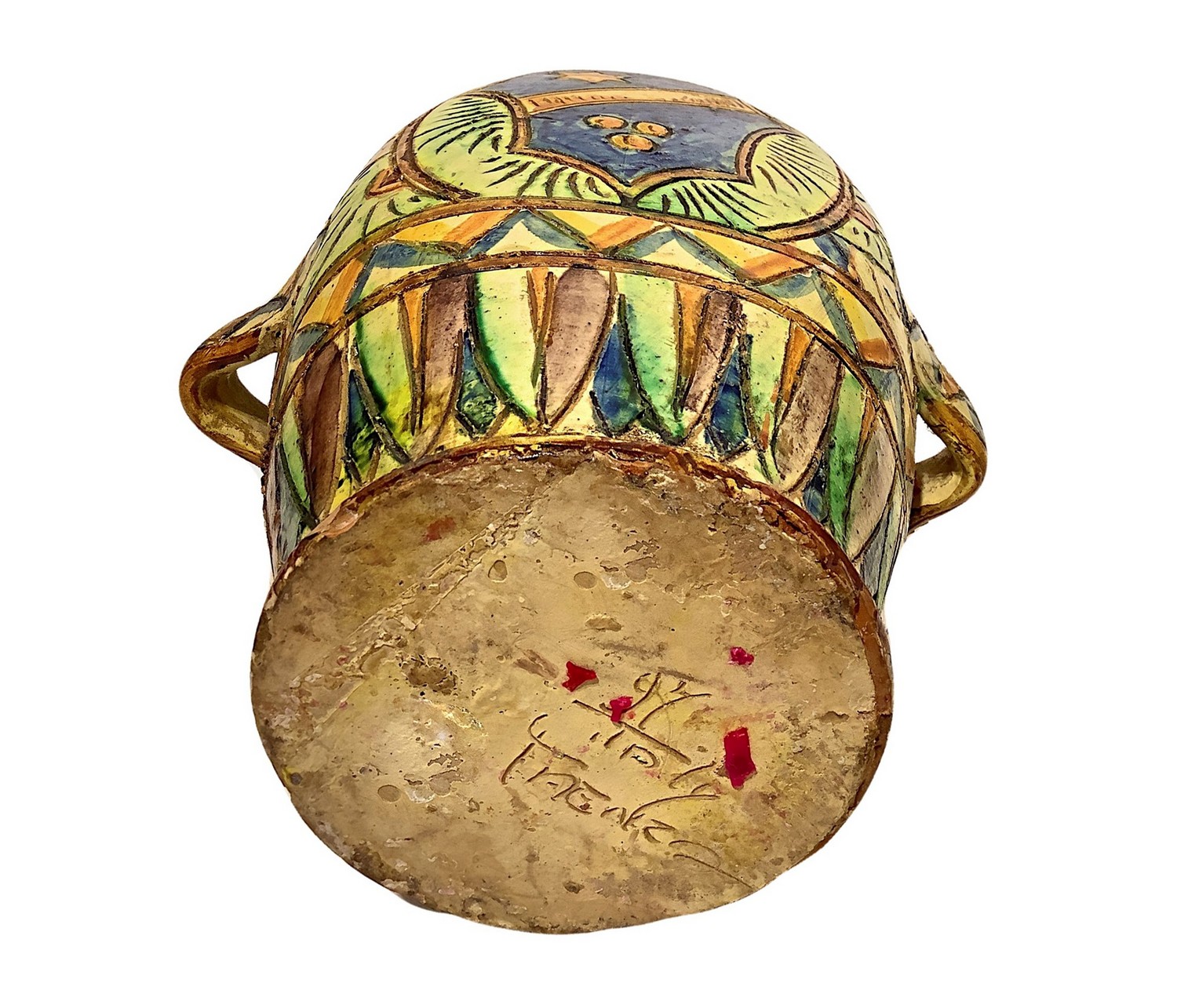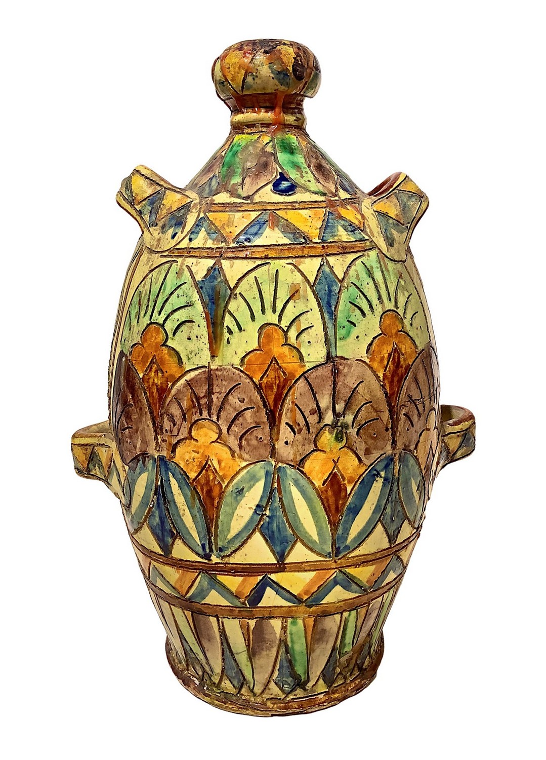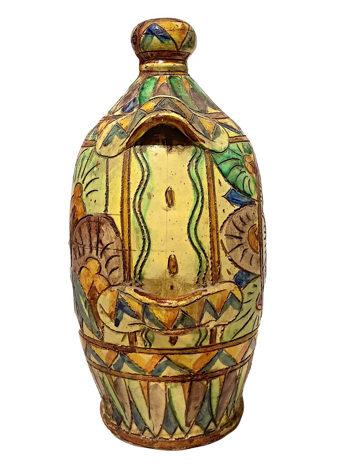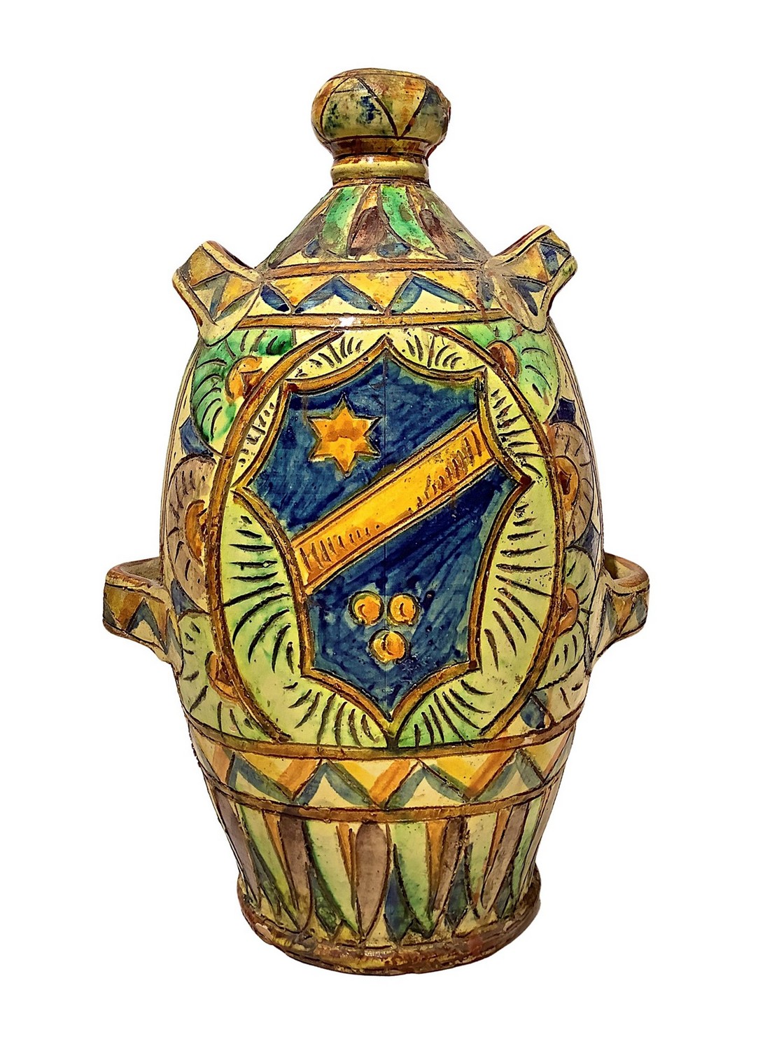 Bottiglia in ceramica policroma, con stemma araldico, Faenza. maiolica H 30 cm XX secolo