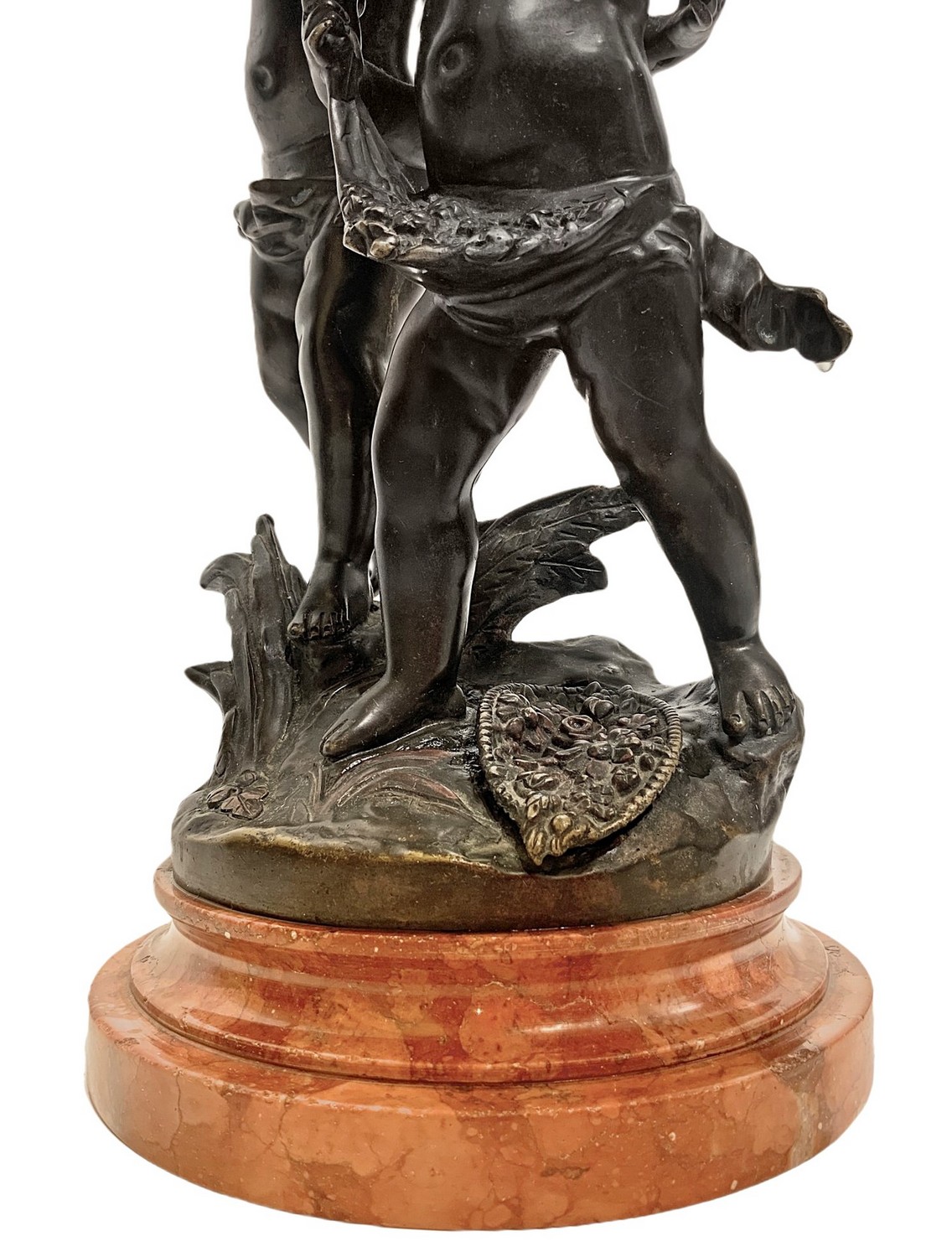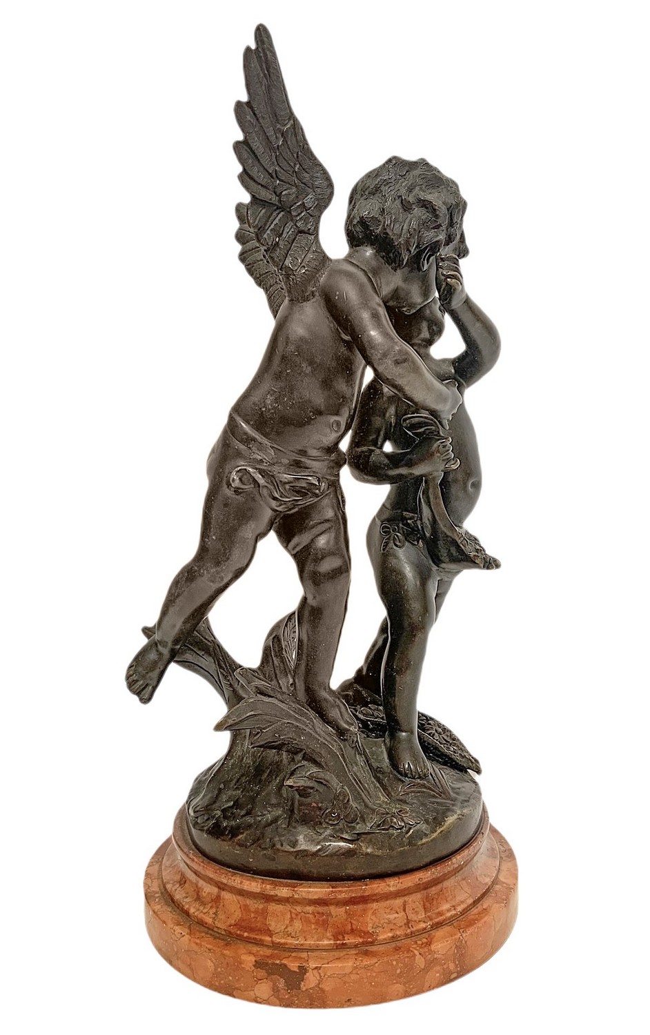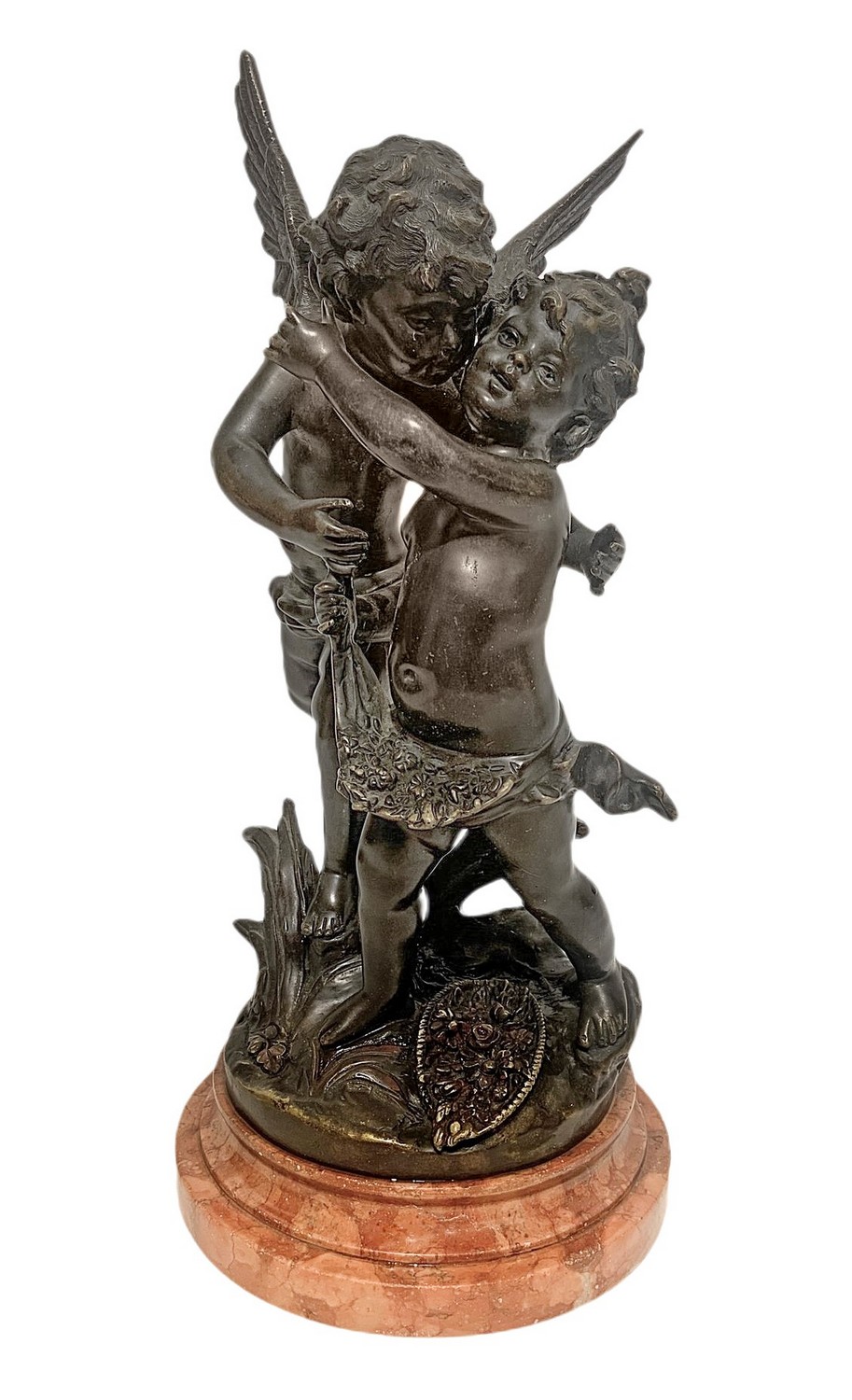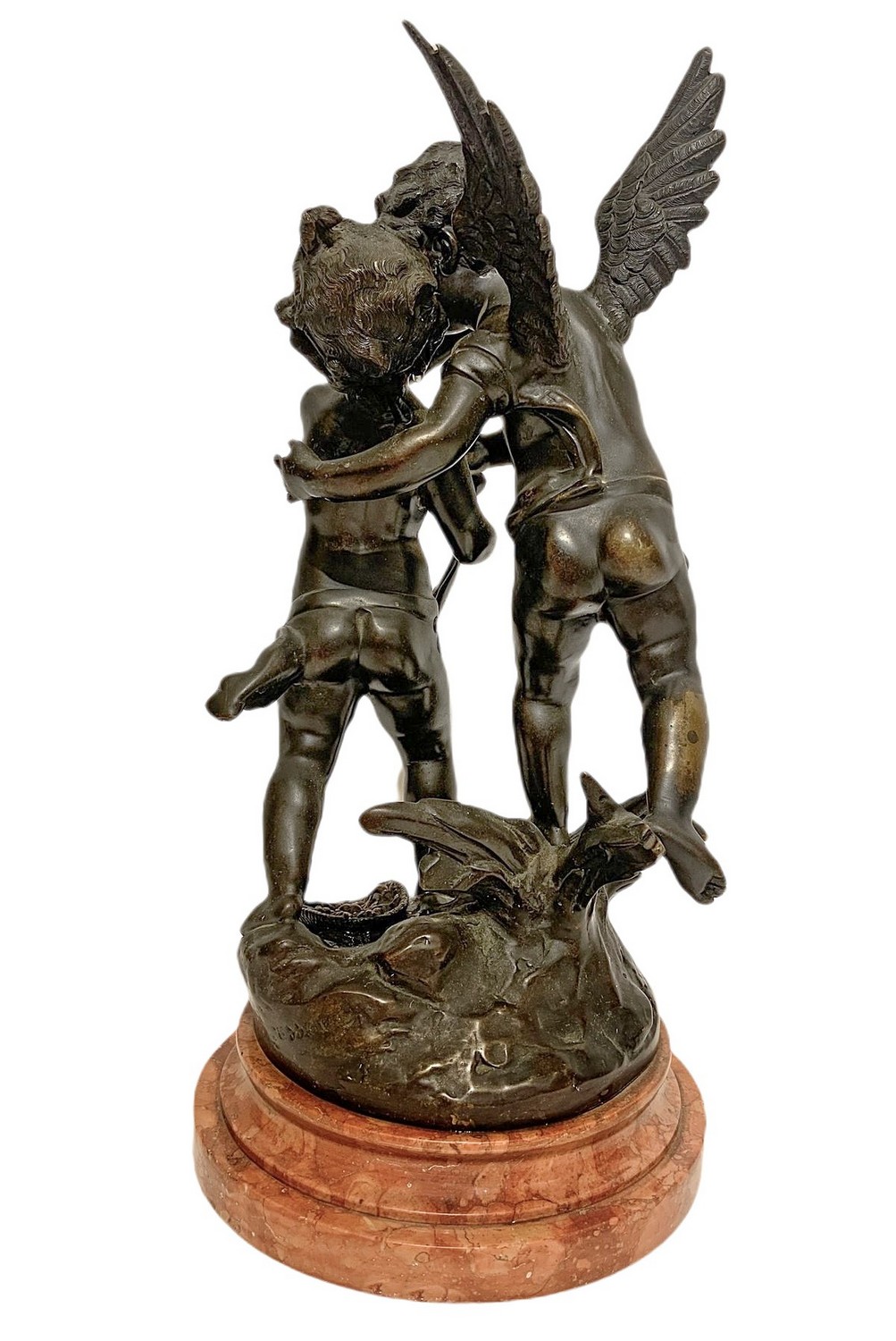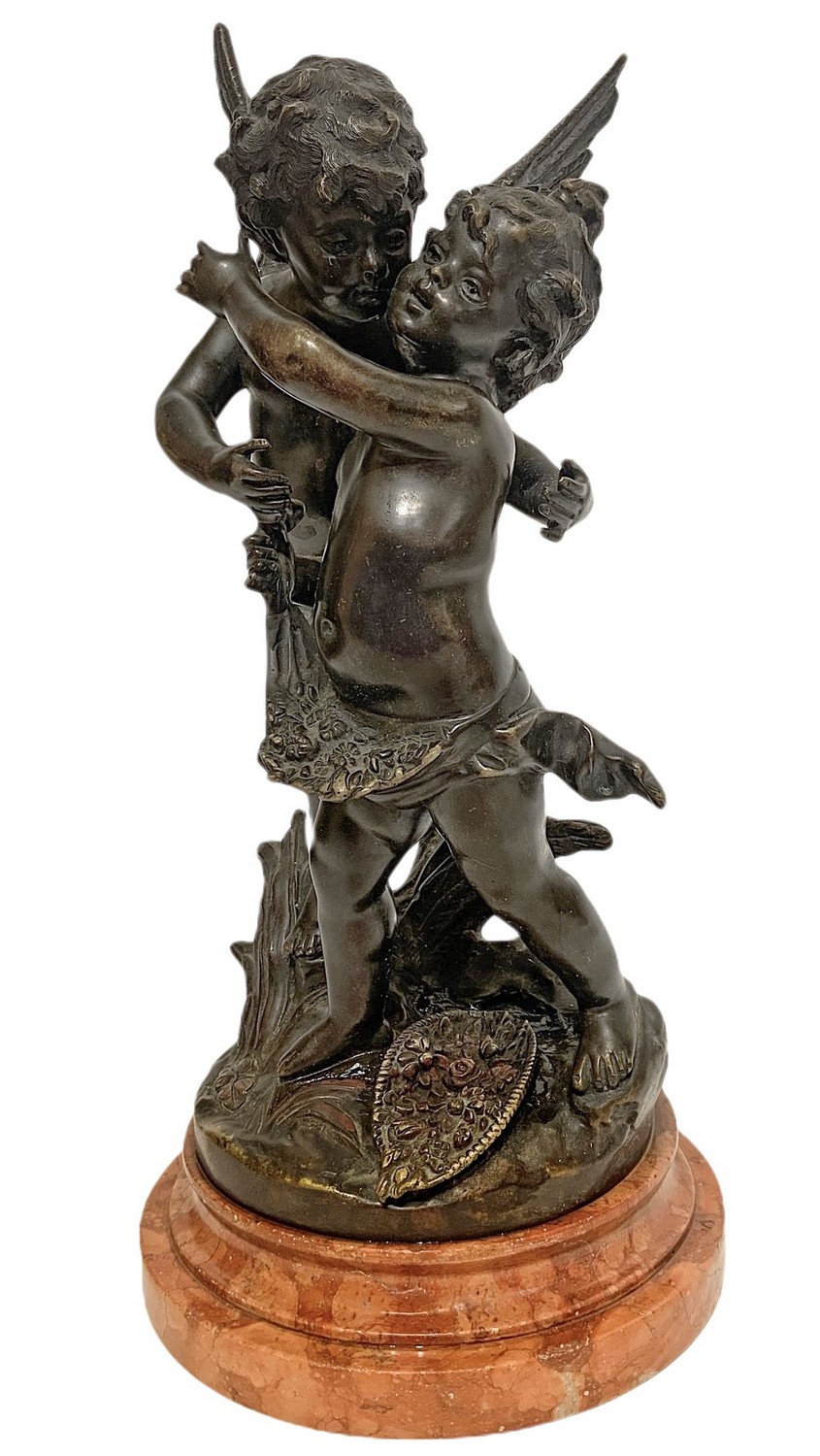 Statua in bronzo raffigurante coppia di angeli, base in marmo. Firmato sul retro Ossemas. H cm 40. H cm 40