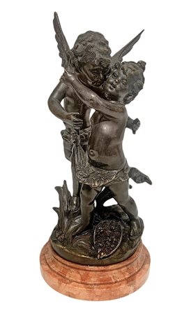 Statua in bronzo raffigurante coppia di angeli, base in marmo. Firmato sul retro Ossemas. H cm 40