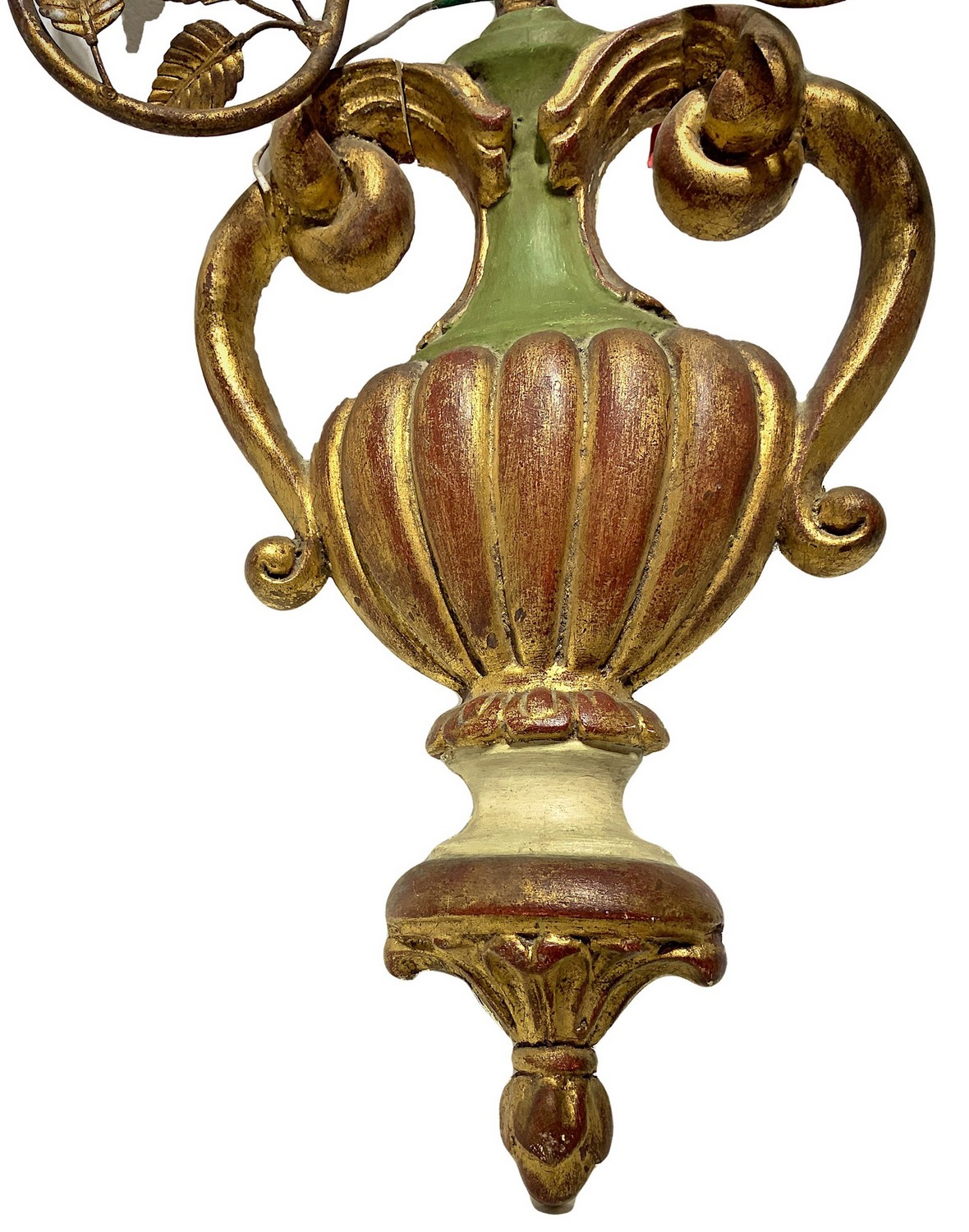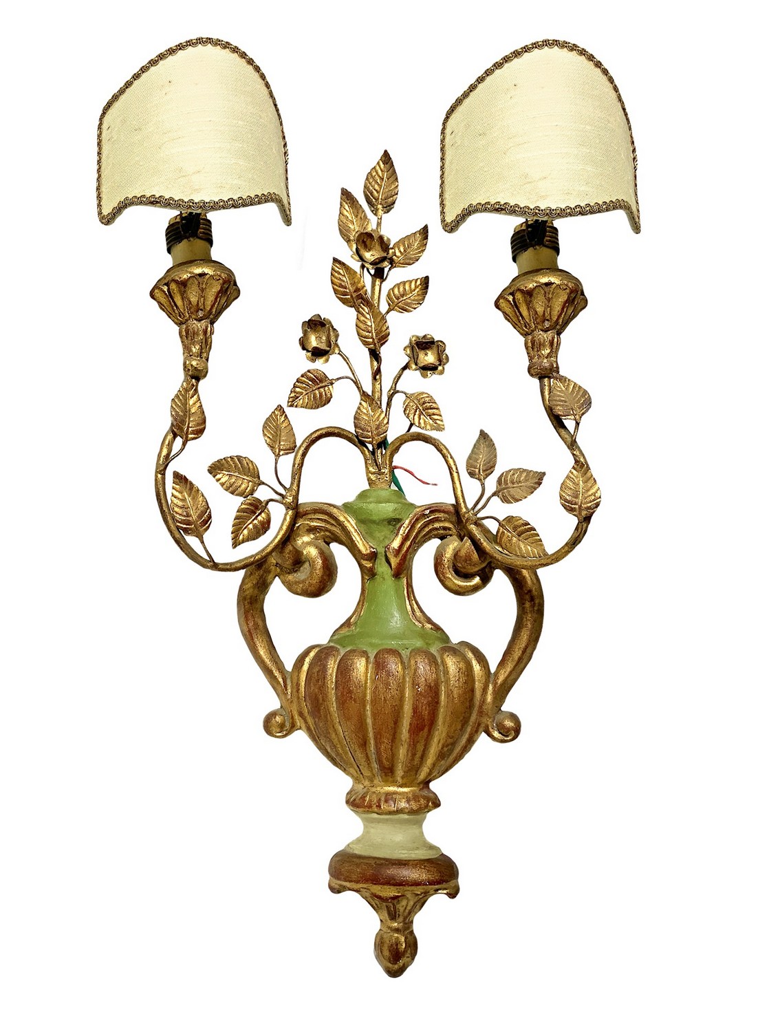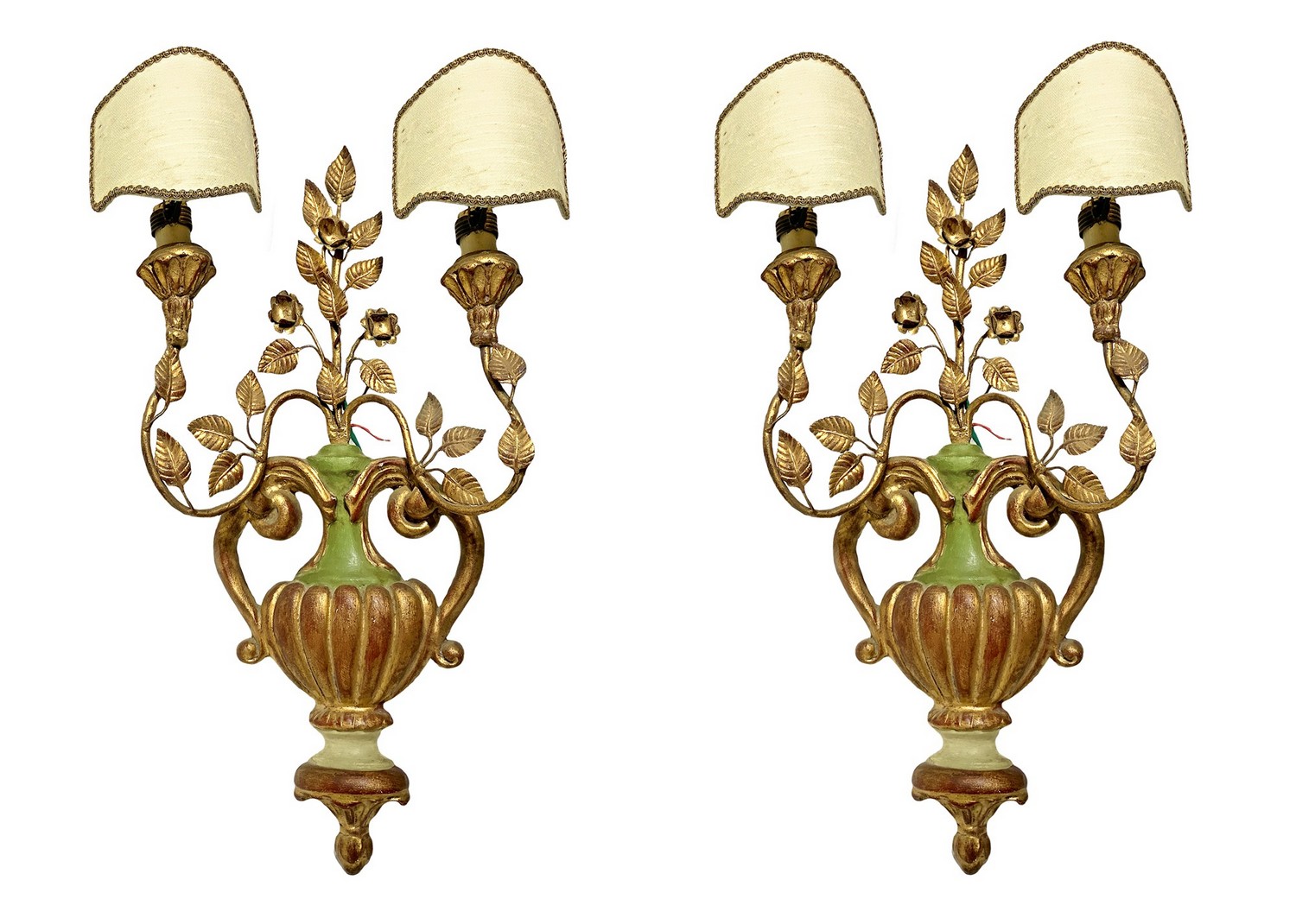 Coppia di applique a forma di vasi in legno e metallo laccato e dorato, a due luci