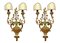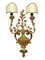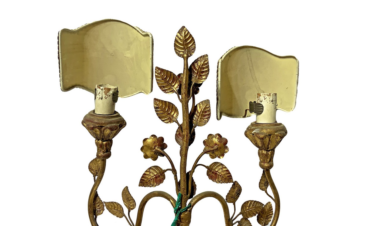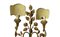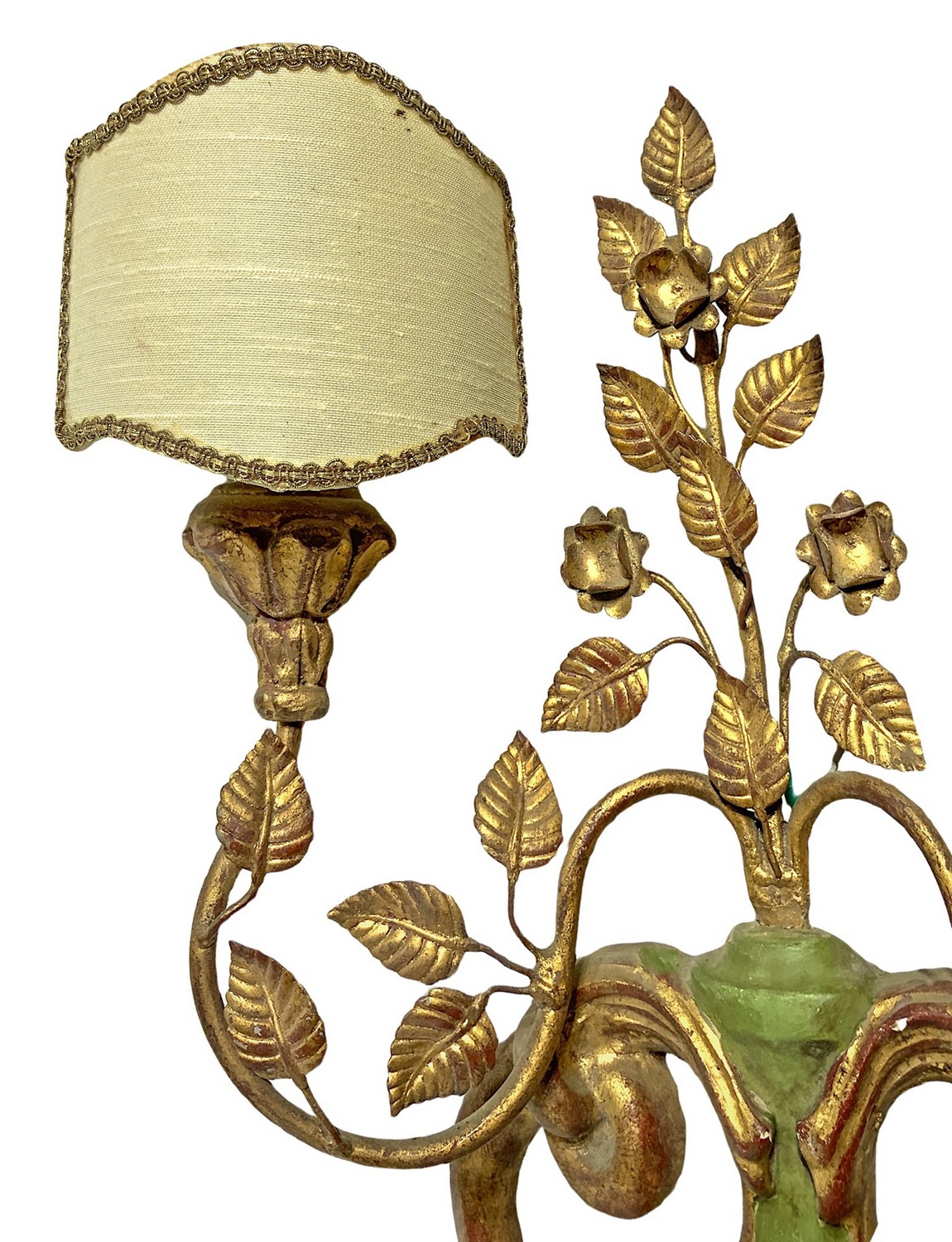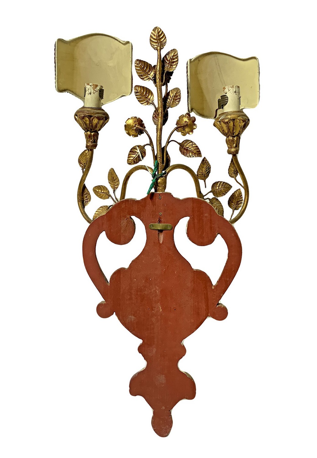 Coppia di applique a forma di vasi in legno e metallo laccato e dorato, a due luci