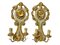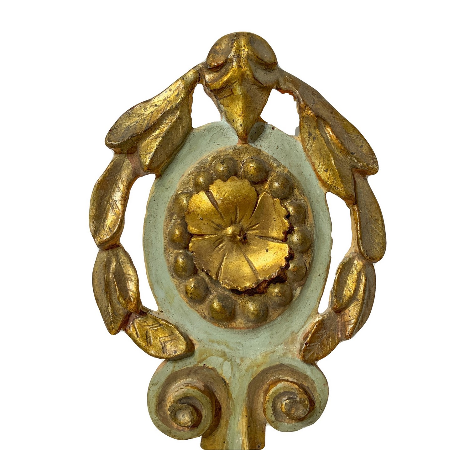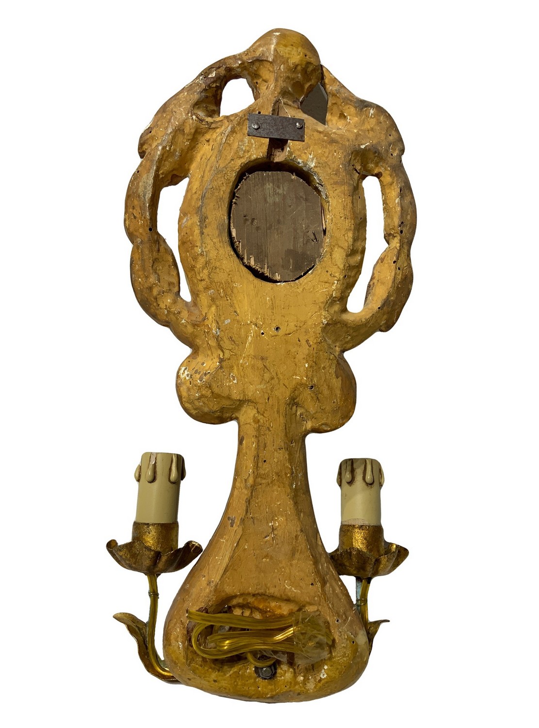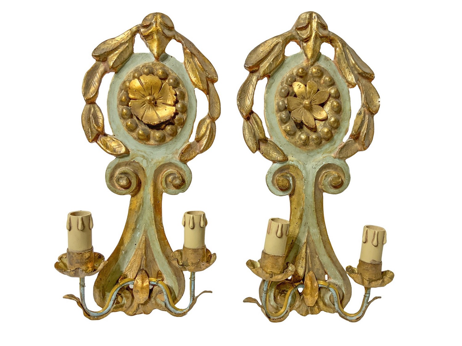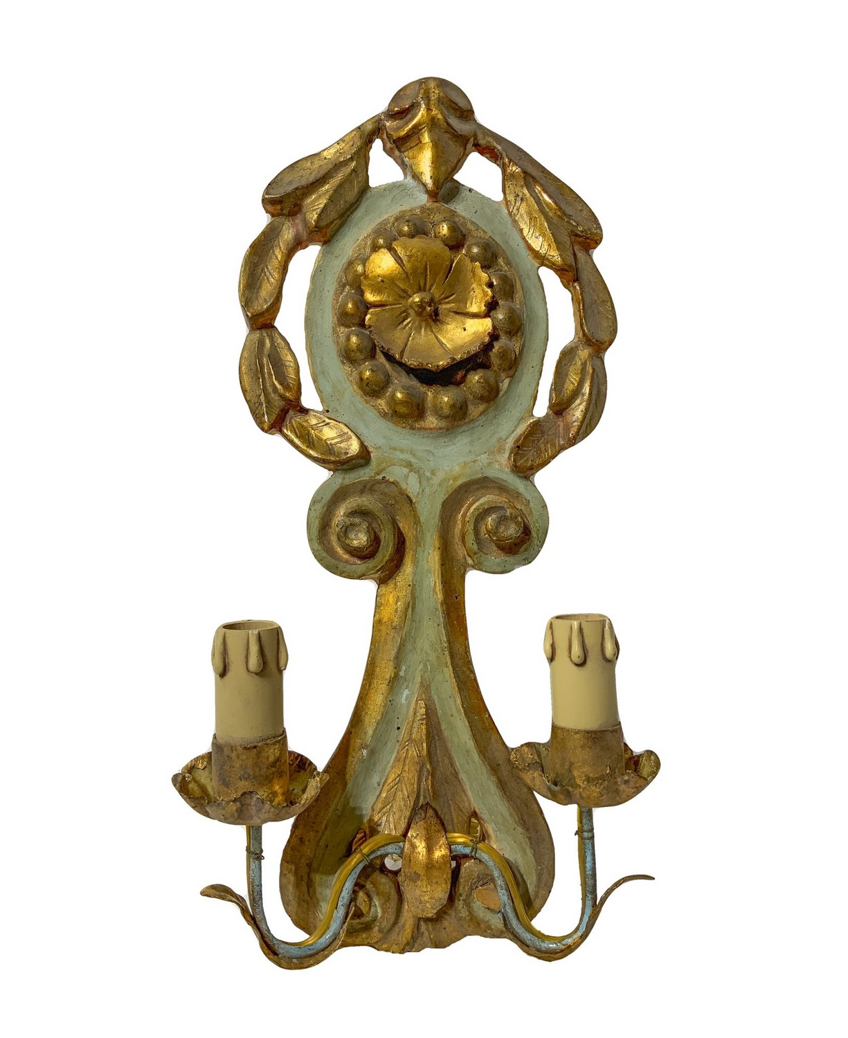 Coppia appliques in legno laccato nei toni del verde e dorato, a due candele.