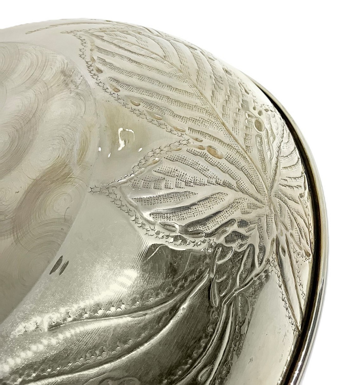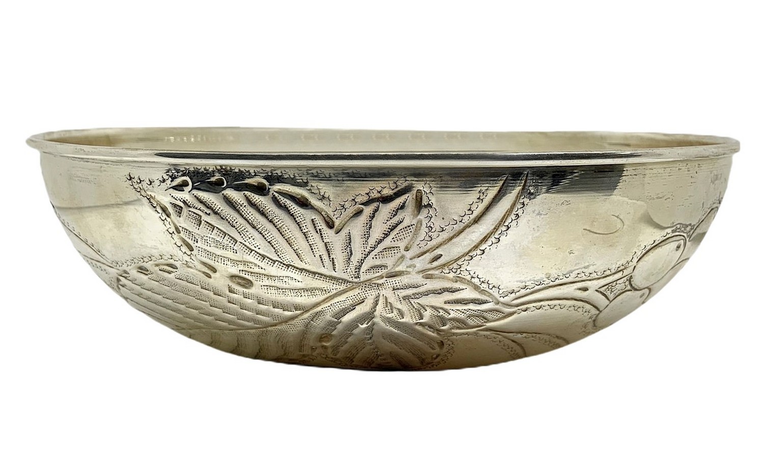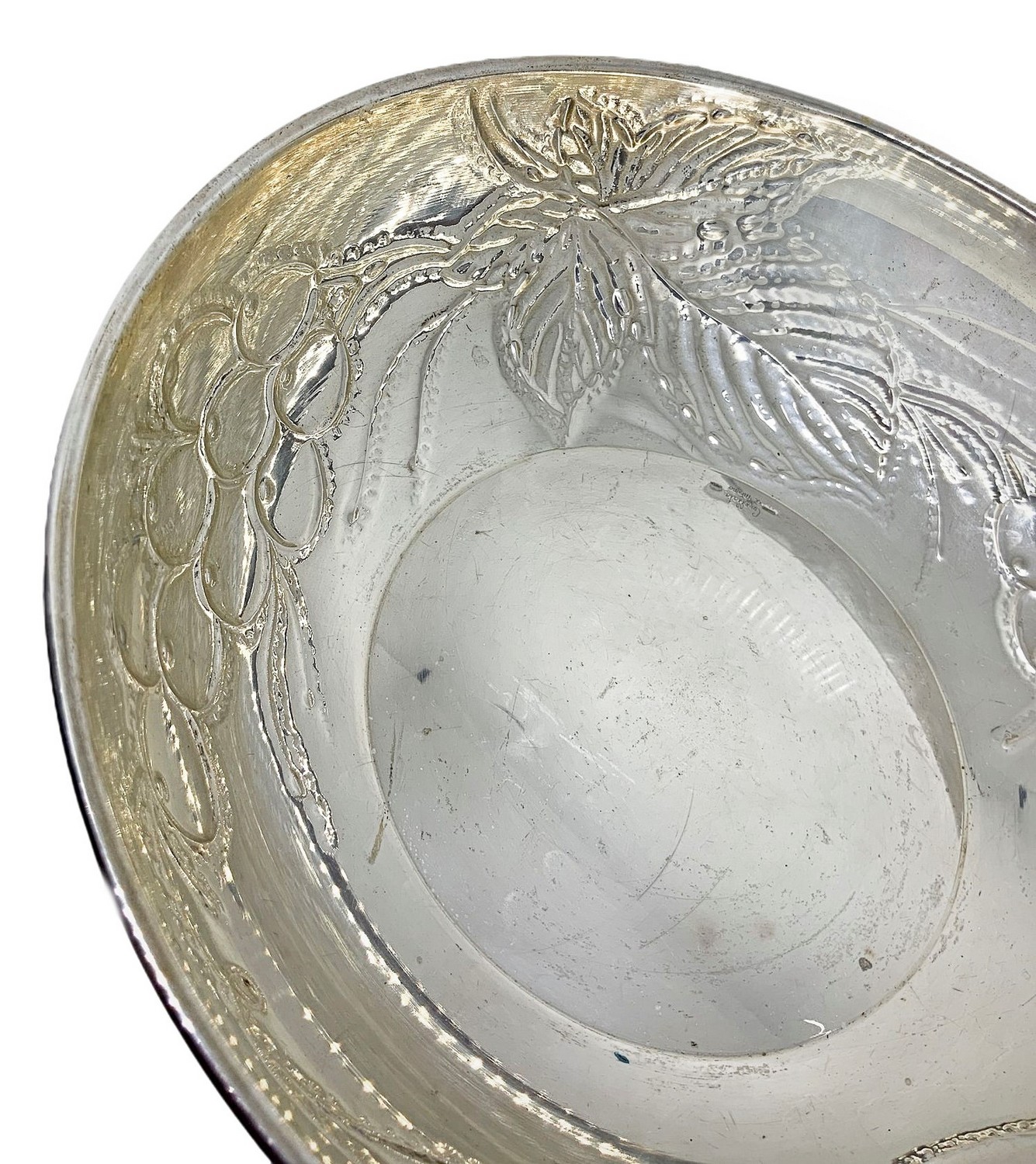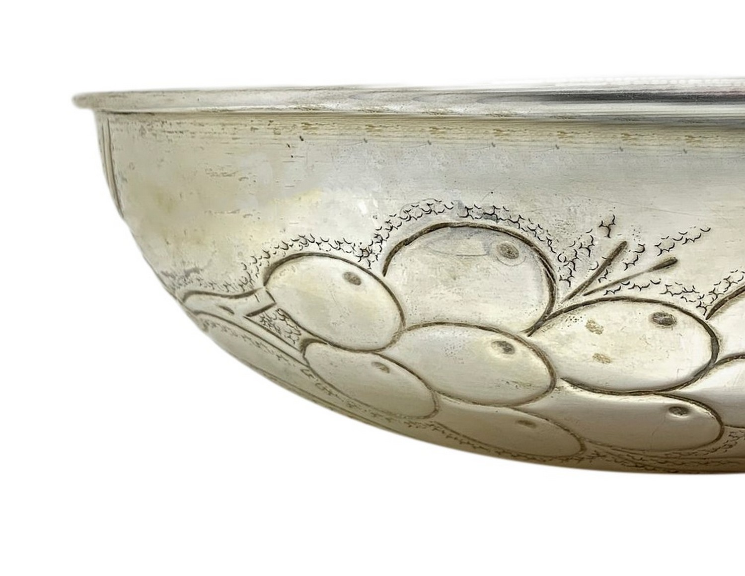 Ciotola in argento sbalzata. con decorazioni di uva cesellata a mano gr.345 h.cm.7,5 diam.25,5 Gr. 345 Diam. 25.5