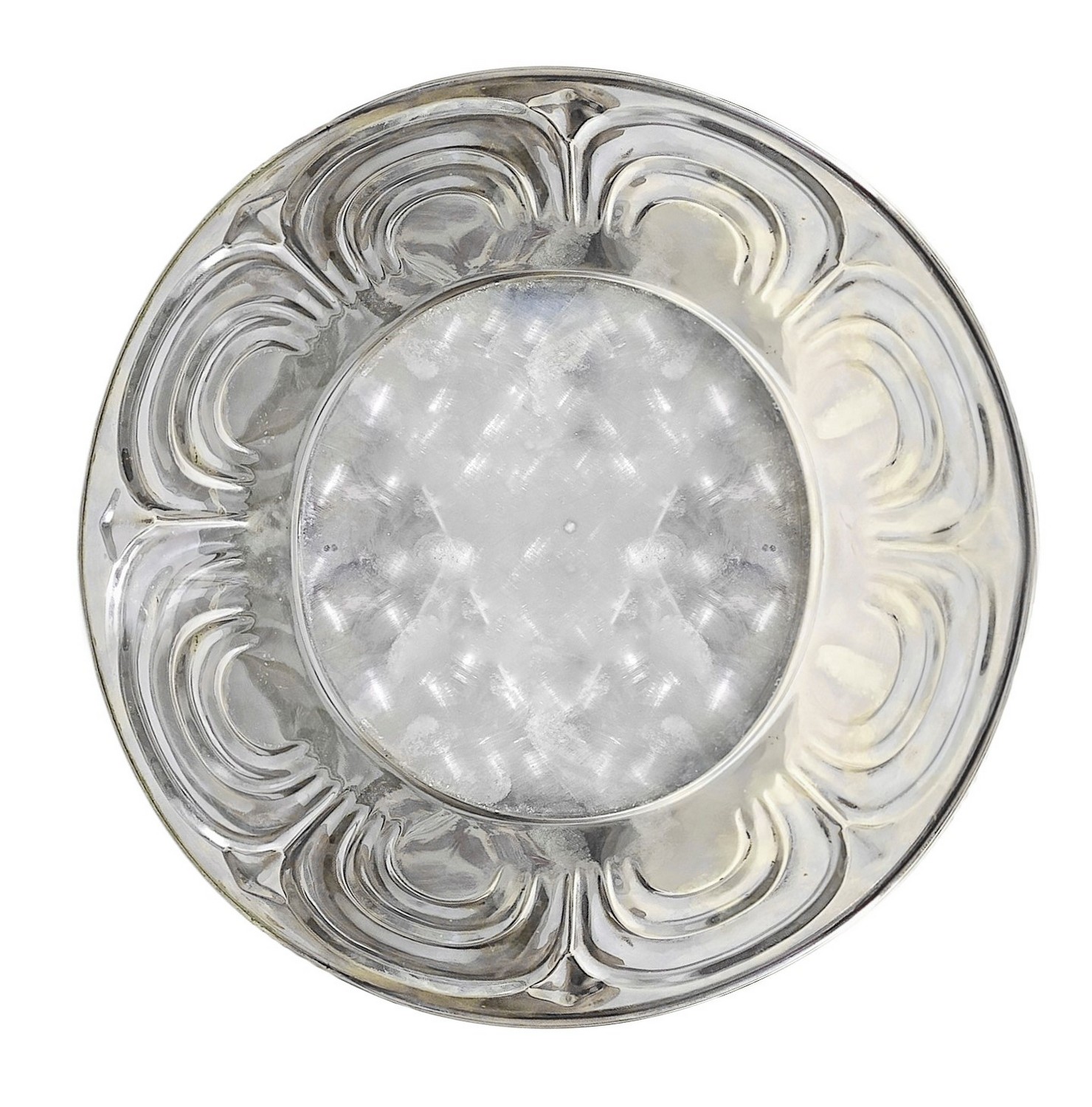 Piatto rotondo in argento 800, sbalzato a motivi di arco.