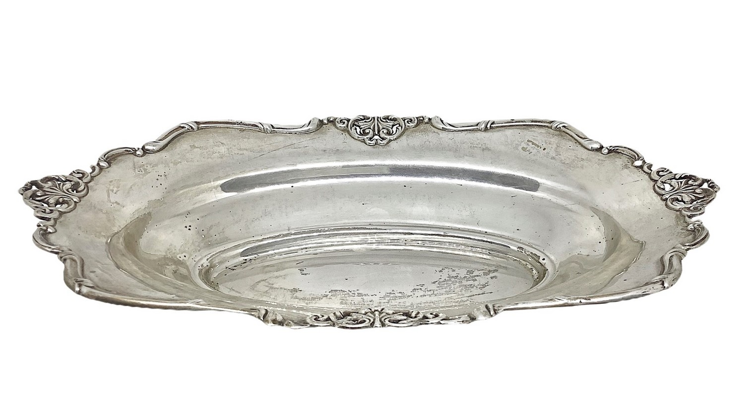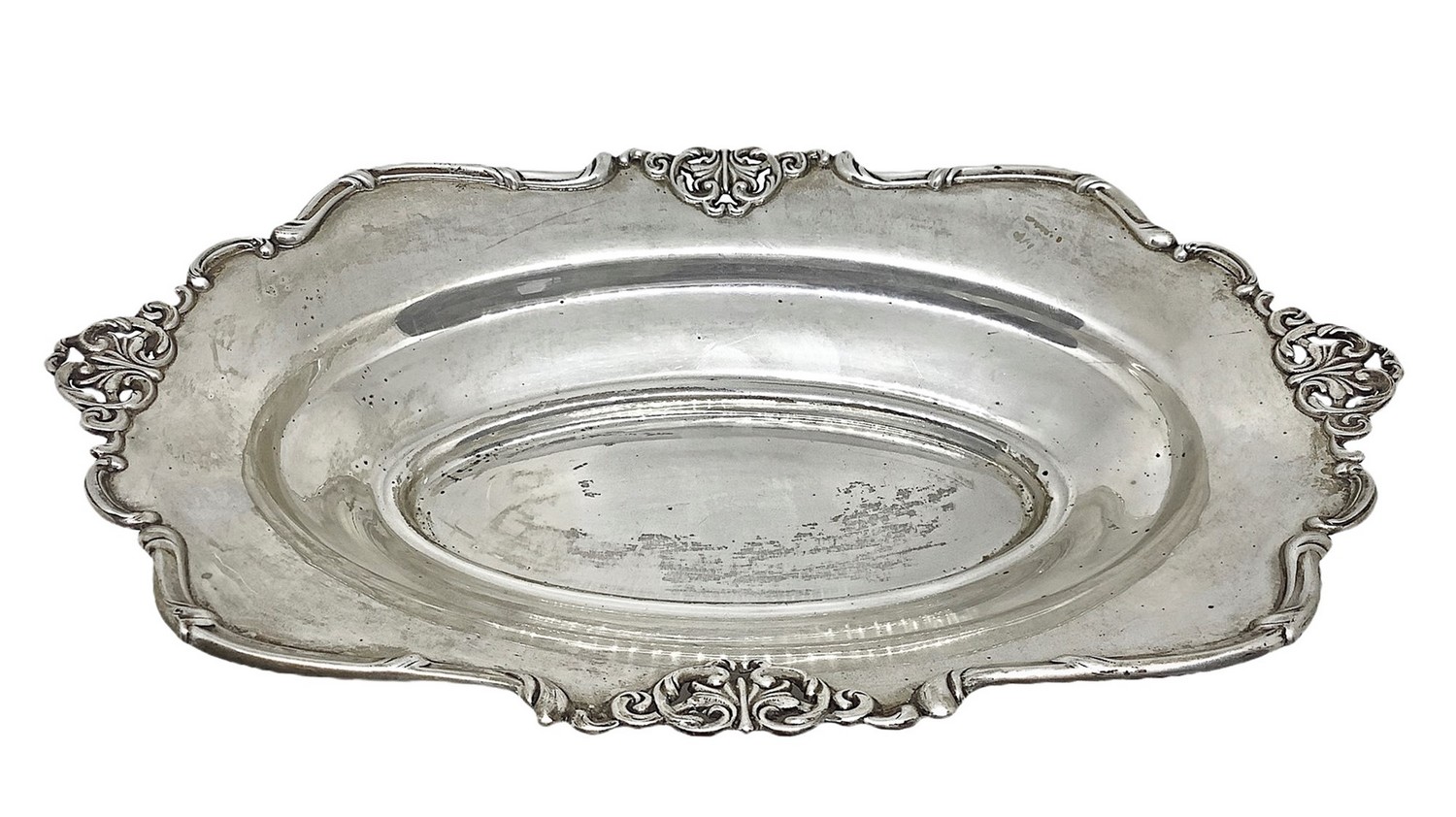 Piccola ciotola in argento 800, con decorazioni sui bordi, XX secolo.. Gr 218. Cm 30x20