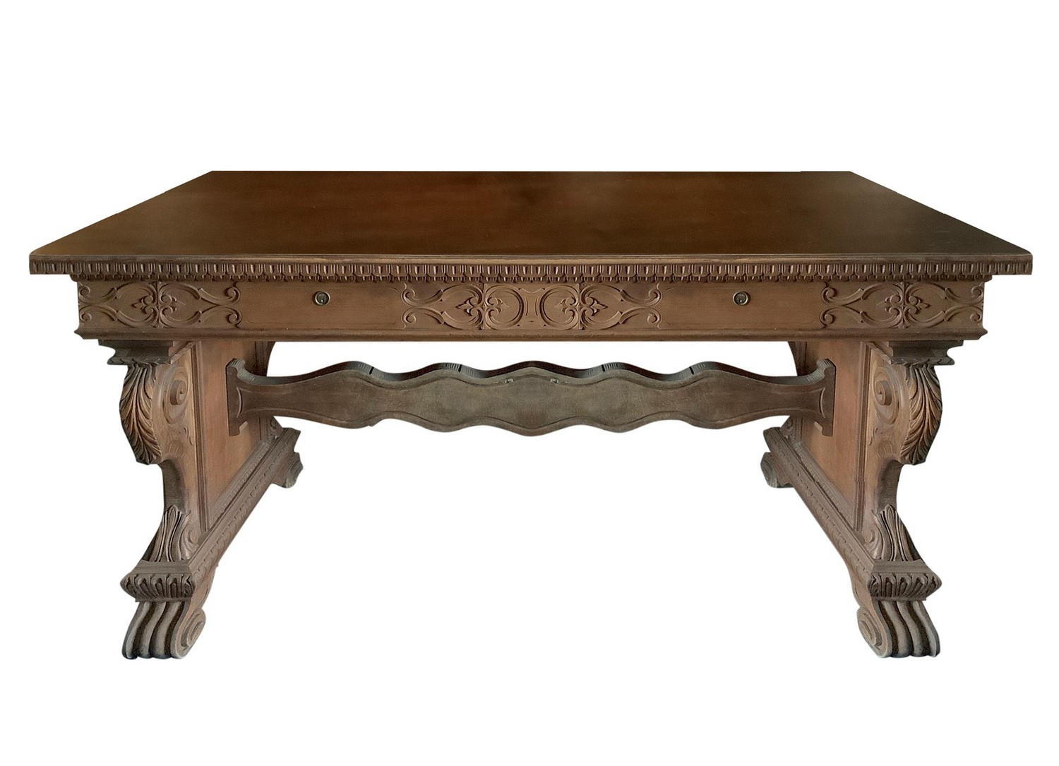 tavolo/scrivania neorinascimentale con poltrona. Tavolo, H 80x175x80, poltrona H cm 100x60 XX secolo