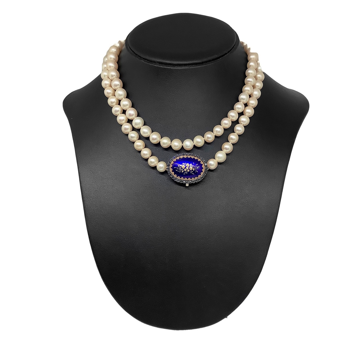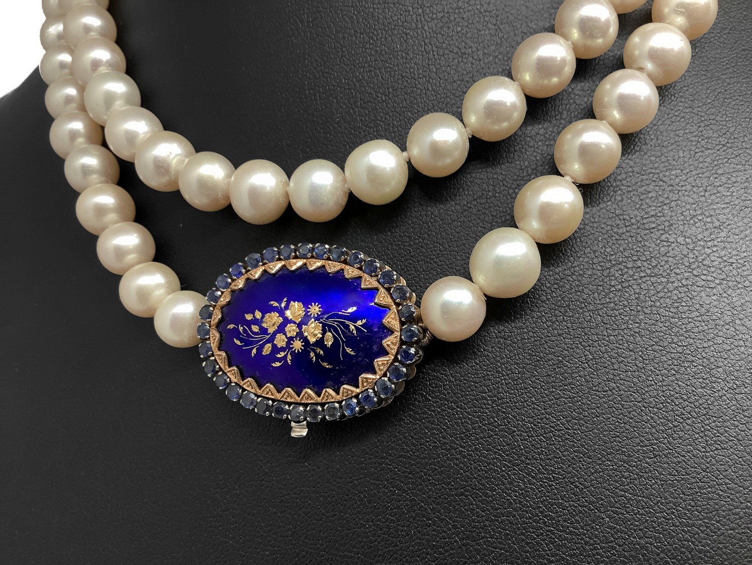 Collana di perle. Importante susta con smalti blu e decori in oro. Perle coltivate. 40 cm, perle 9 mm XX secolo