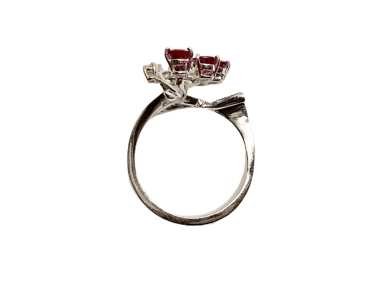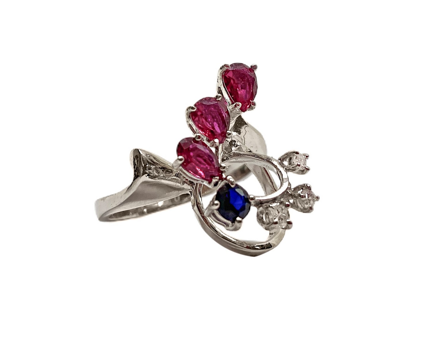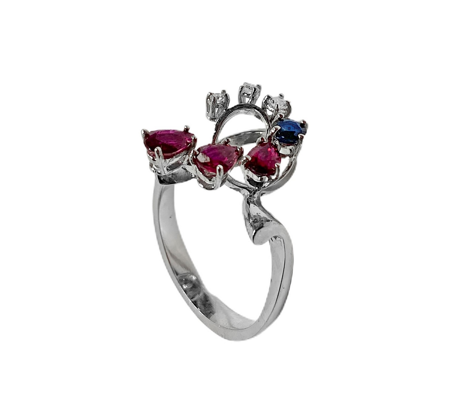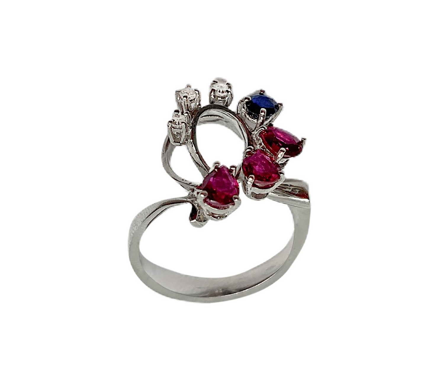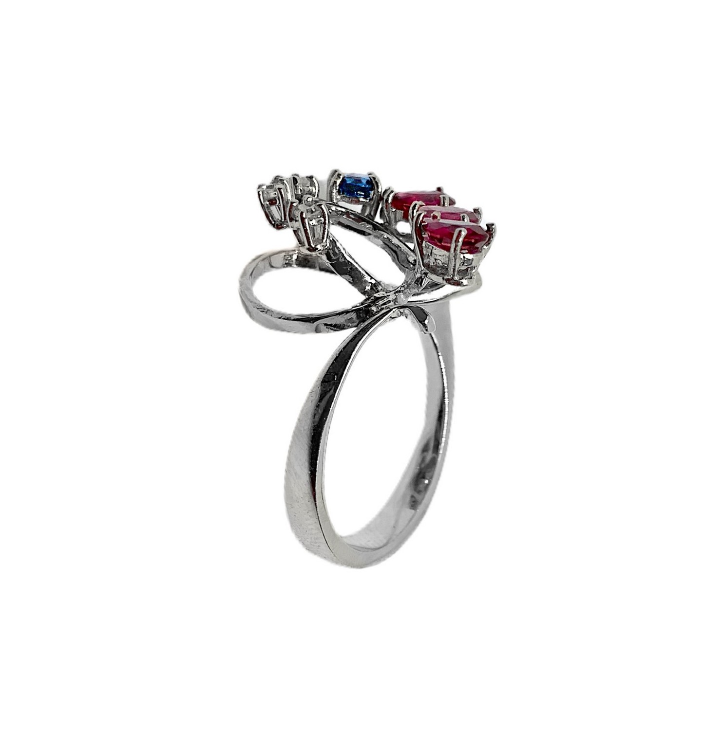 Anello oro bianco con 3 rubini, 1 zaffiro blu e 3 brillanti