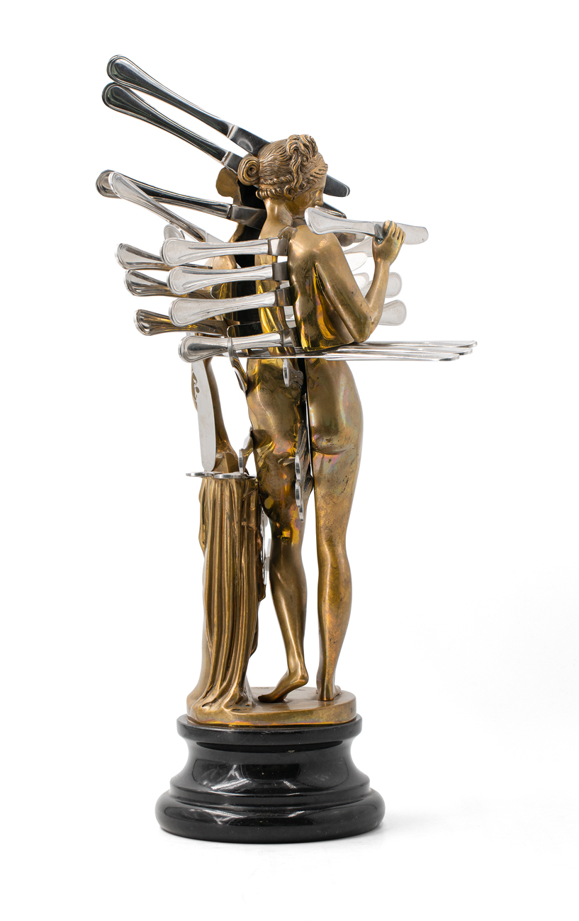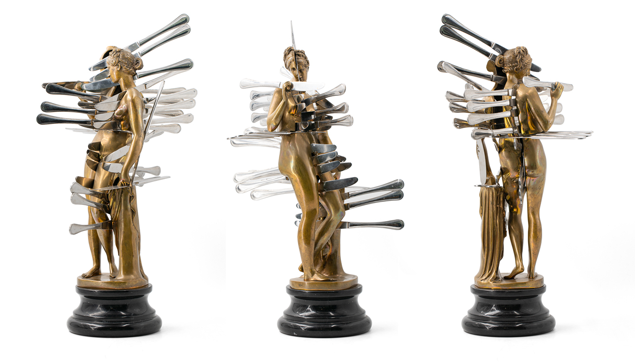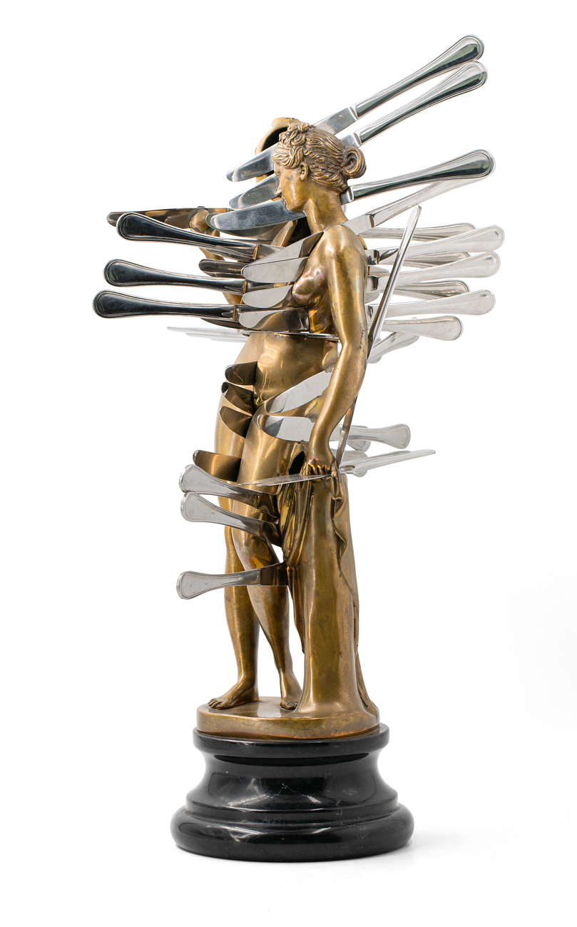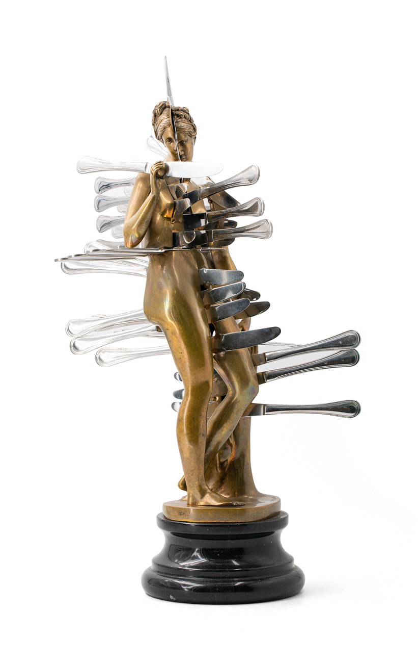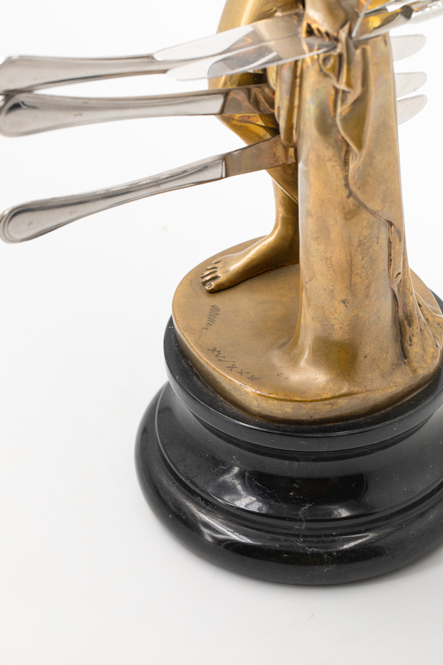 Scultura in bronzo fuso a cera persa e coltelli, poggiante su base in marmo