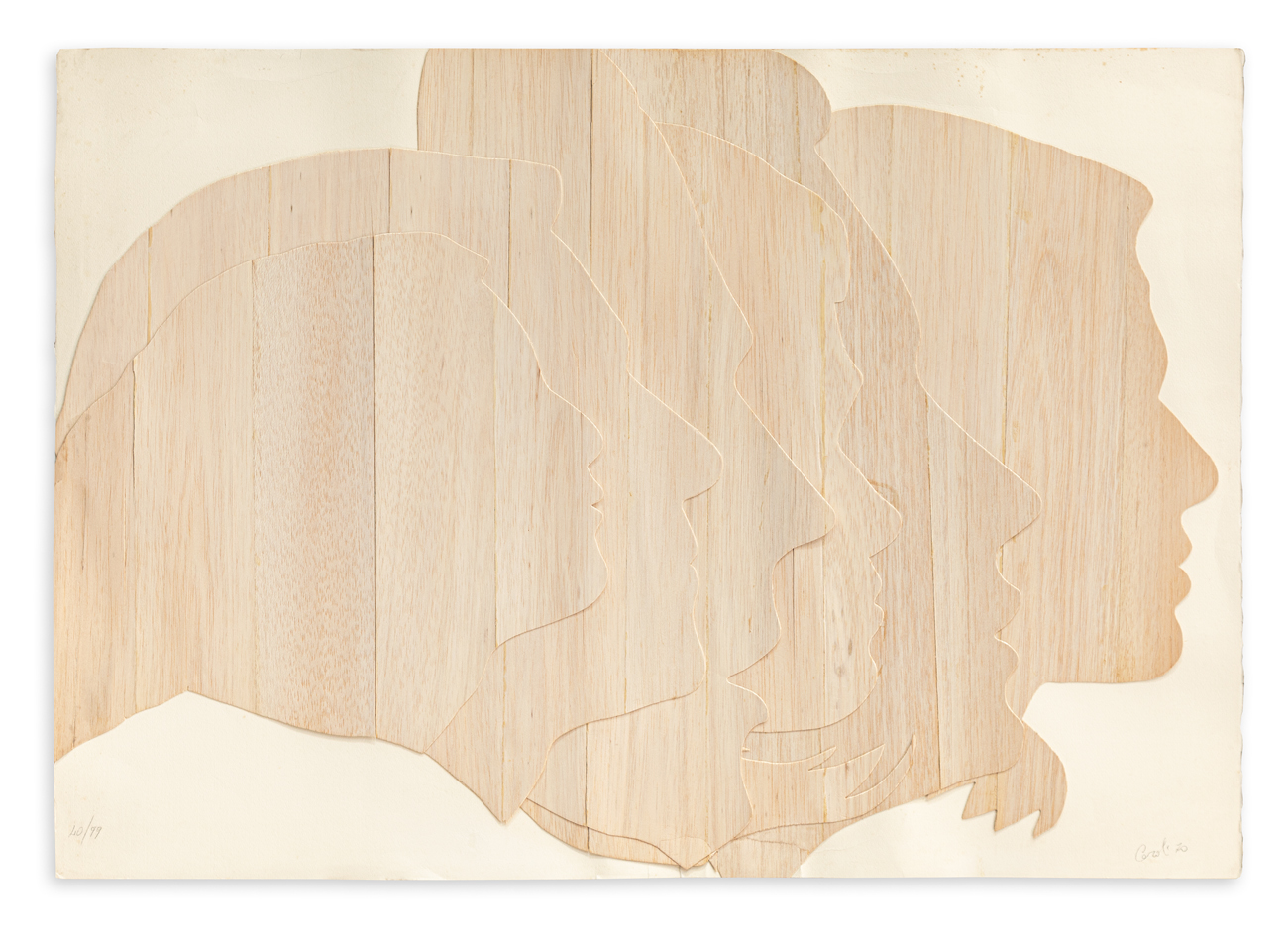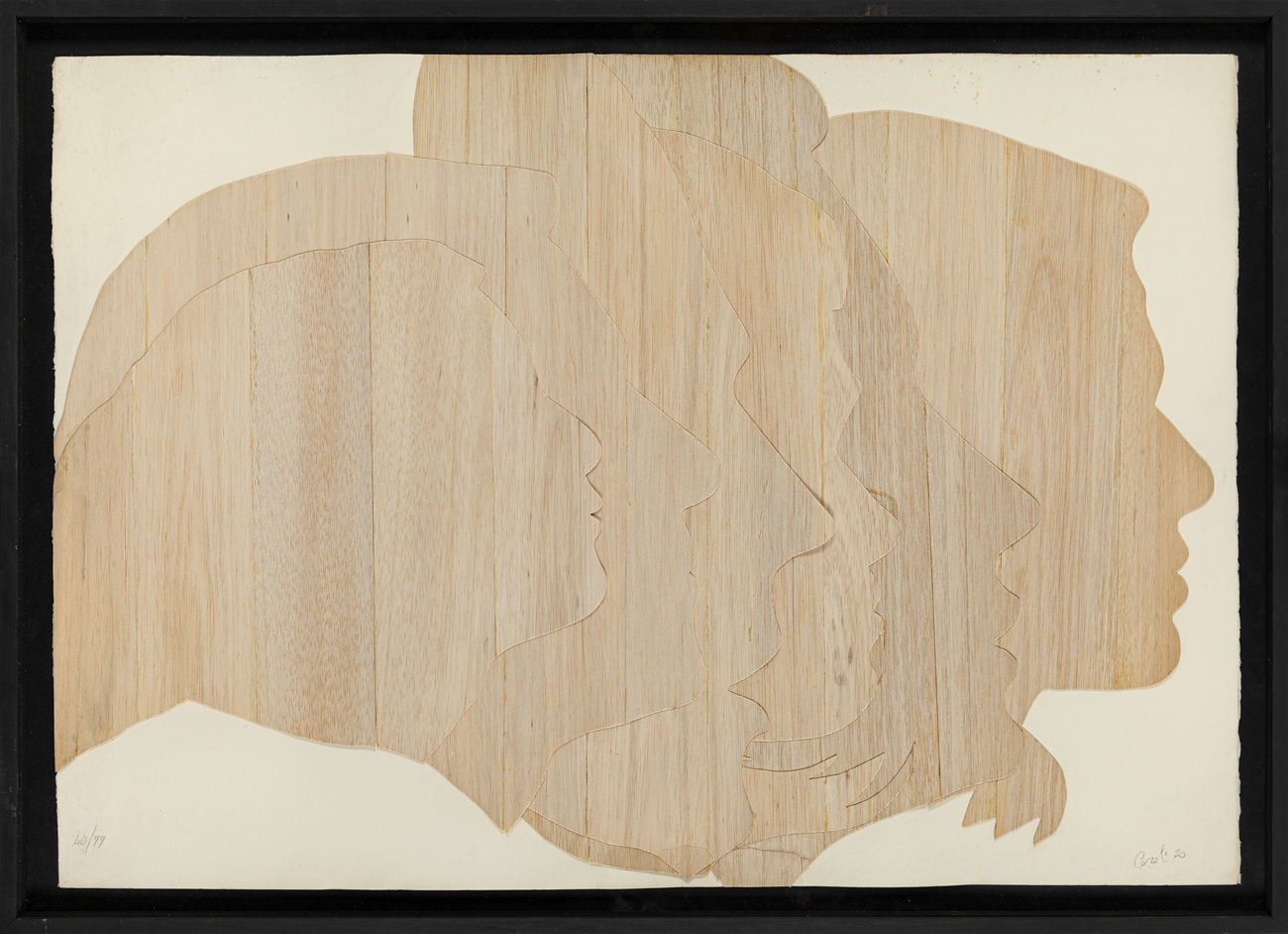 Multiplo realizzato con legni sagomati e sovrapposti applicati su cartoncino