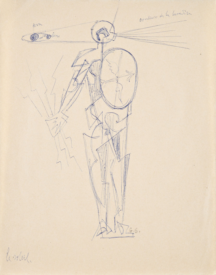 Gino Severini , Cortona 1883 , Parigi 1966 "Le Soleil" china su carta, cm 27,7x22 Firmato con le iniziali in basso al centro e titolato in basso a sinistra Si tratta dello studio di un particolare per un grande pannello eseguito nel 1960, come decorazione per il salone del transatlantico Leonardo da Vinci e ora collocato all'interno del Palazzo dell'Unione Europea a Bruxelles Si ringrazia la signora Romana Severini Brunori per il prezioso contributo alla compilazione della scheda di questo lotto