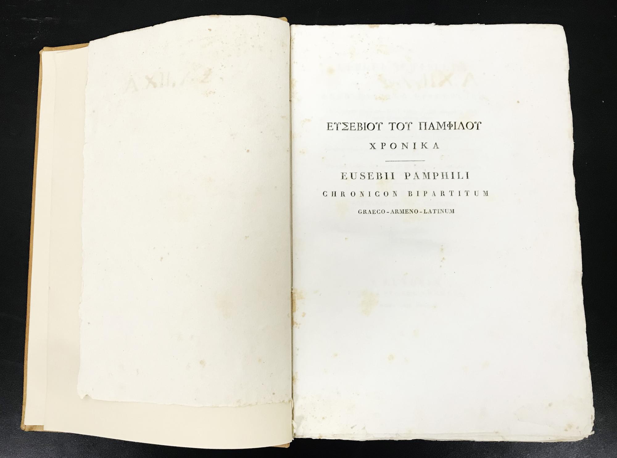Nunc primum ex armeniaco textu in latinum conversum, adnotationibus auctum, graecis fragmentis exornatum. Opera P.Jo: Baptistae Aucher Ancyrani. (Vol I. Historico-chronographica. Vol. II.Chronicus canon.) Venezia, Typis Coenobi PP. Armenorum in Insula S. Lazari, 1818