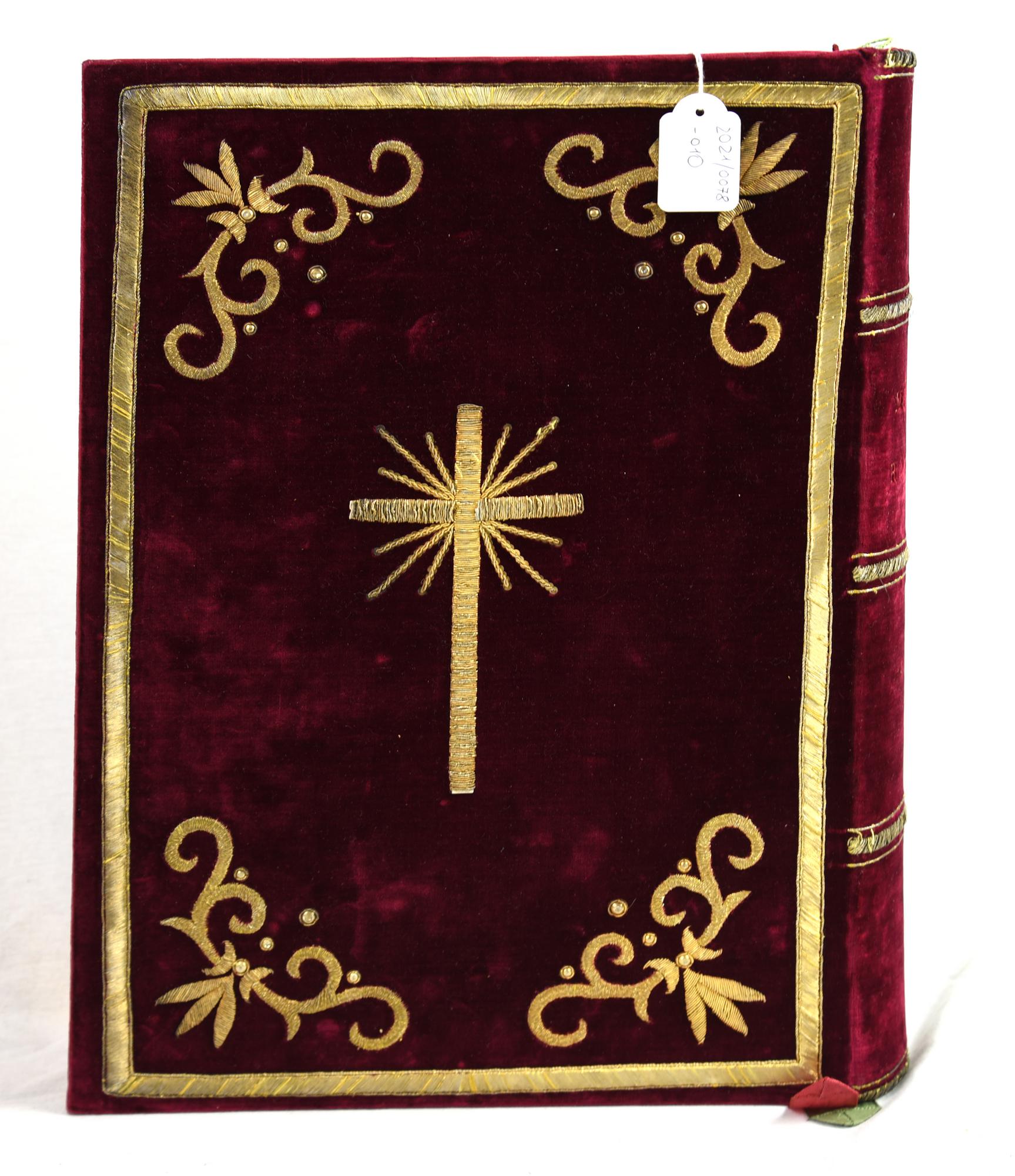 Ottime condizioni. Taglio dorato, legatura in velluto rosso con decorazioni a ricamo in oro, tre nervi a ricamo dorato