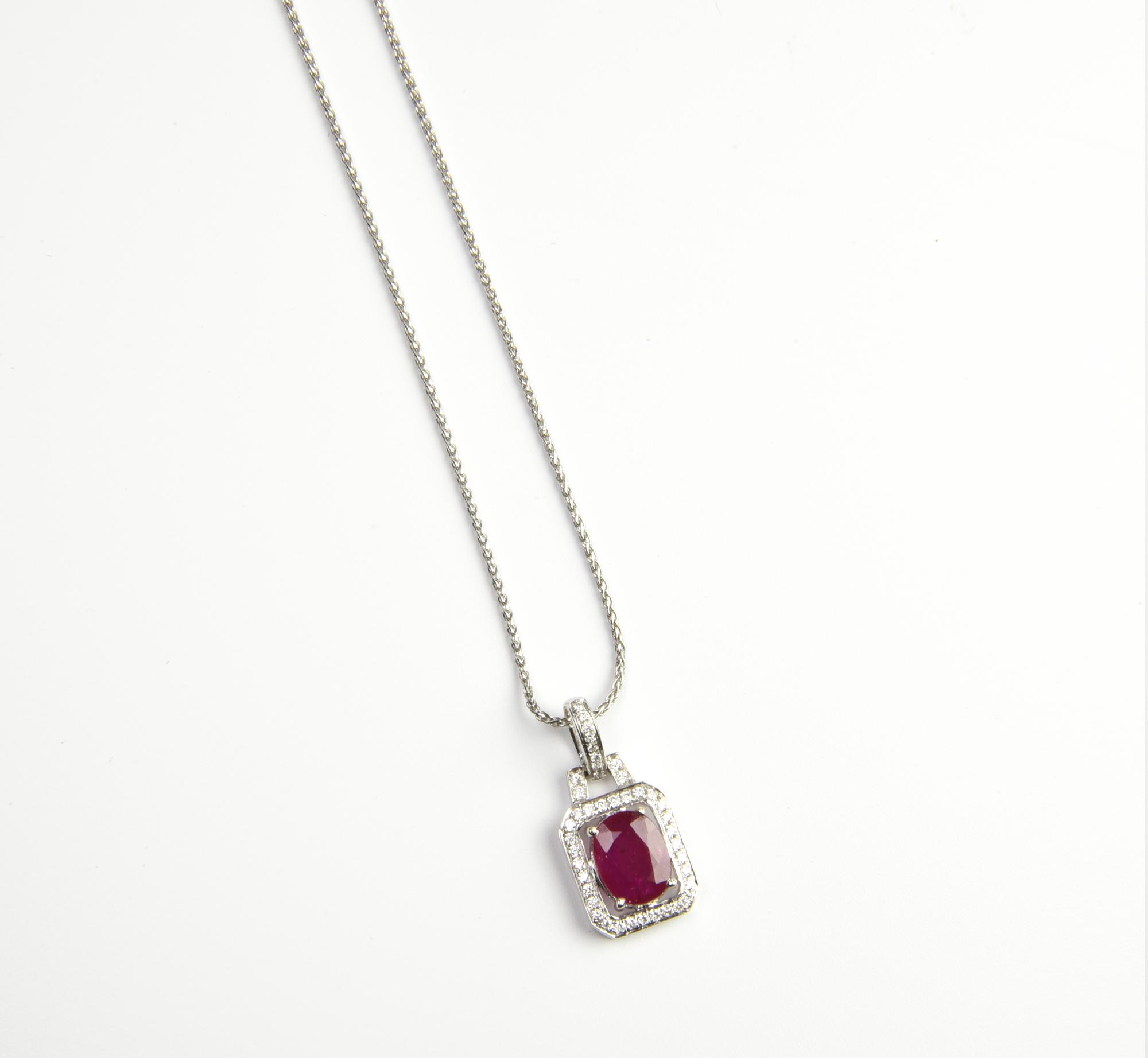 in oro bianco 18kt, con al centro rubino birmano ovale di 1,92 ct circa e diamanti taglio brillante per 0,27 ct circa, corredato da catenina in oro bianco.
