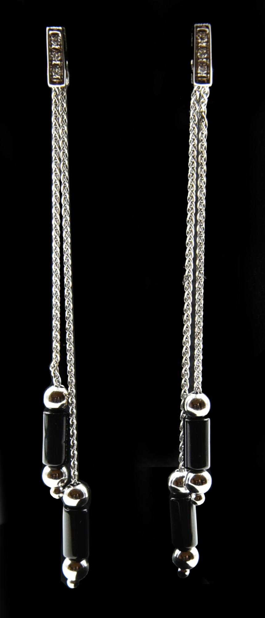 in oro bianco 18 kt, a doppio filo, impreziositi da cilindri in onice, sfere in oro bianco 18kt di 4 mm e da diamanti per 0,06 ct circa.