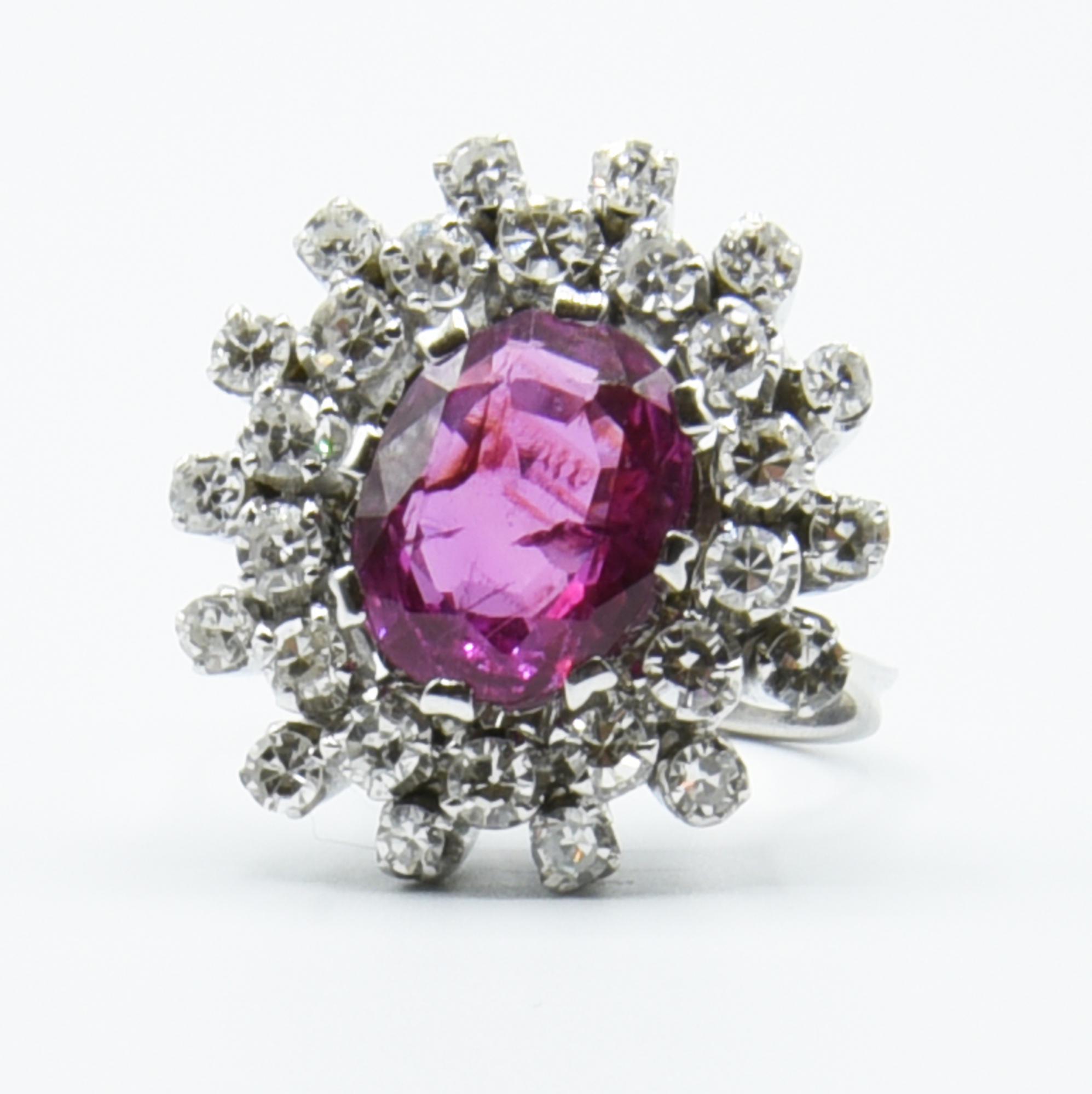 Lotto 43 | ANELLO MARGHERITA CON RUBINO E DIAMANTI in oro bianco 18 kt, con al cenro...