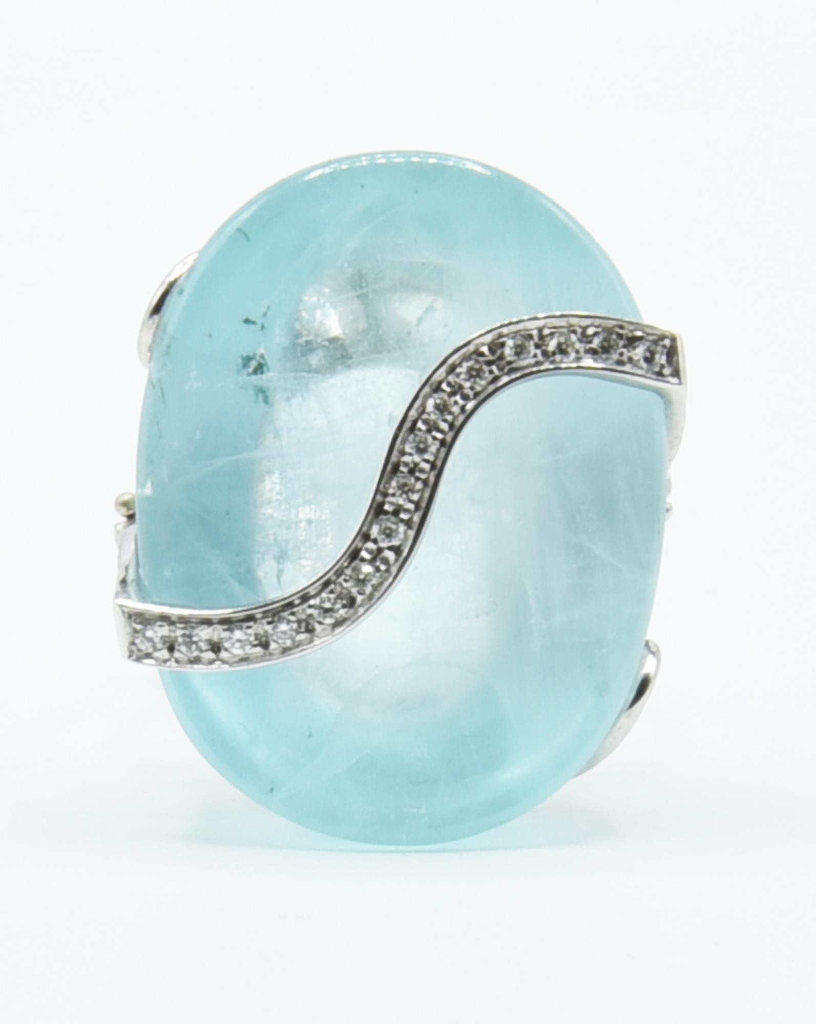 in oro bianco 18kt, con grande acquamarina ovale taglio cabochon di 56,00 ct circa al centro, entro cestello decorato da una fascia superiore in oro bianco e diamanti per 0,20 ct circa.