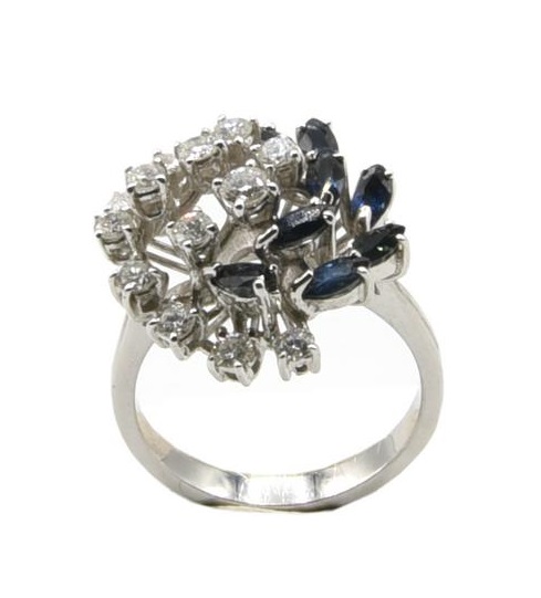 in oro bianco 18kt, con zaffiri naturali blu Thailandia a navette per 1,50 ct circa e diamanti taglio brillante per 0,95 ct circa.