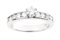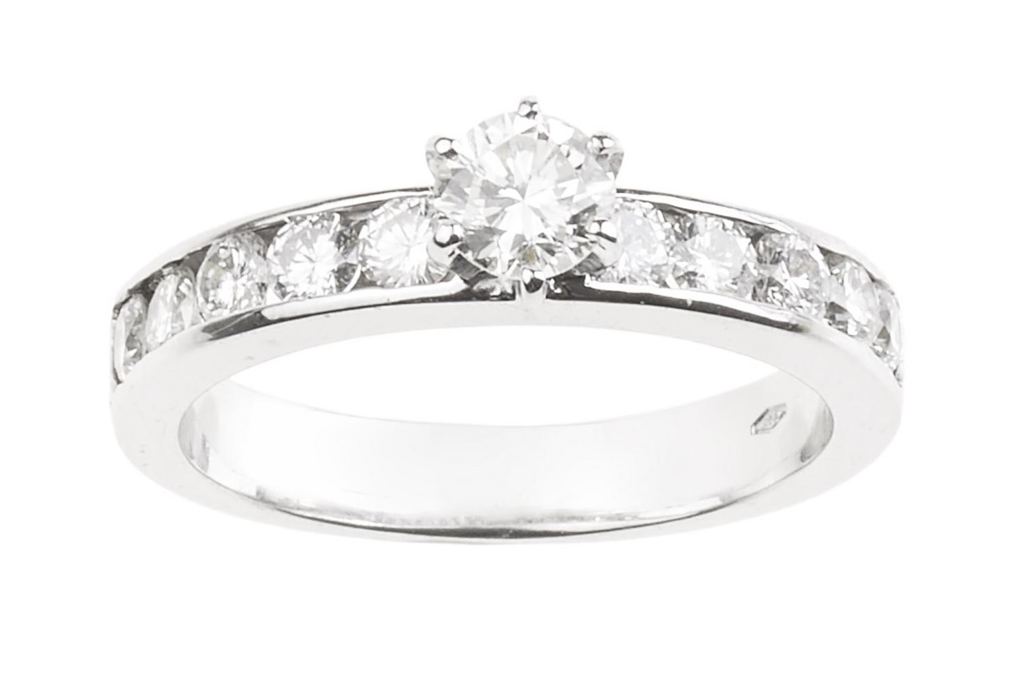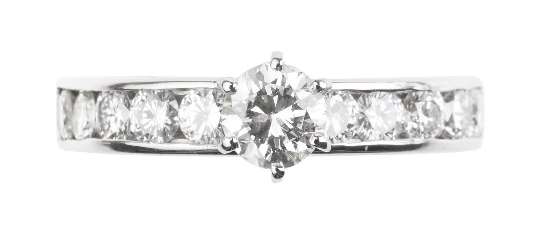 in oro bianco 18kt, al centro un diamante di forma rotonda a brillante di ct 0,52 circa, colore G, purezza VS2, impreziosito ai lati da dieci diamanti per ct 1 totali circa.
