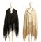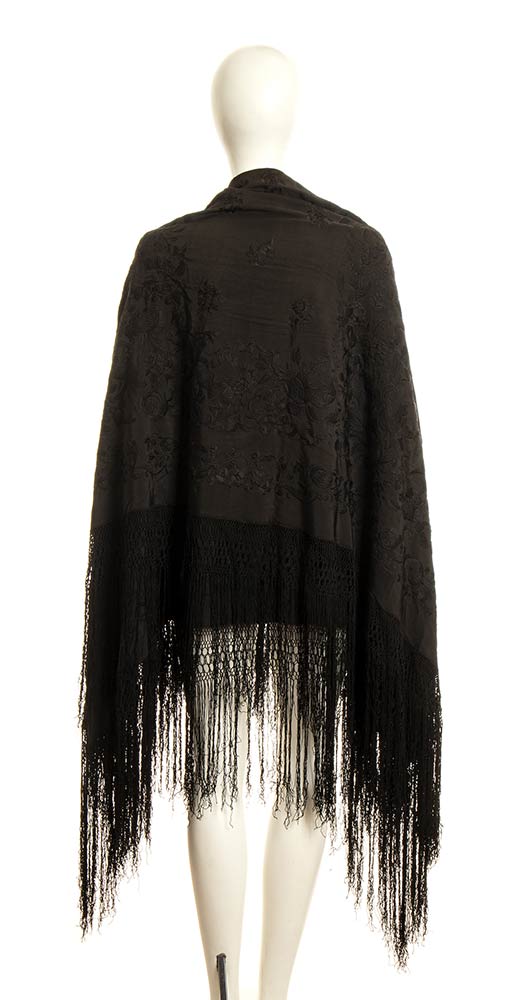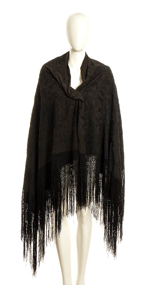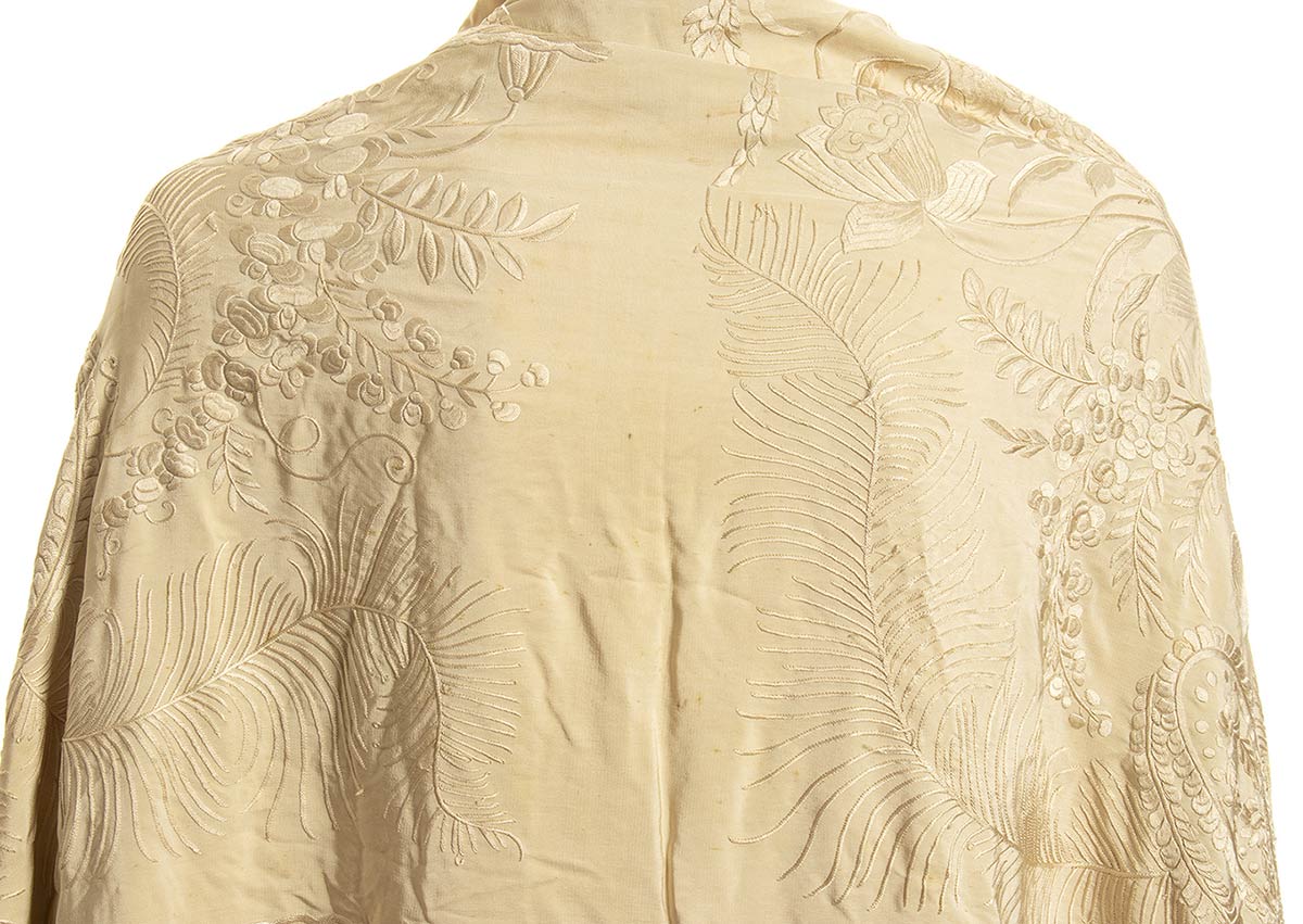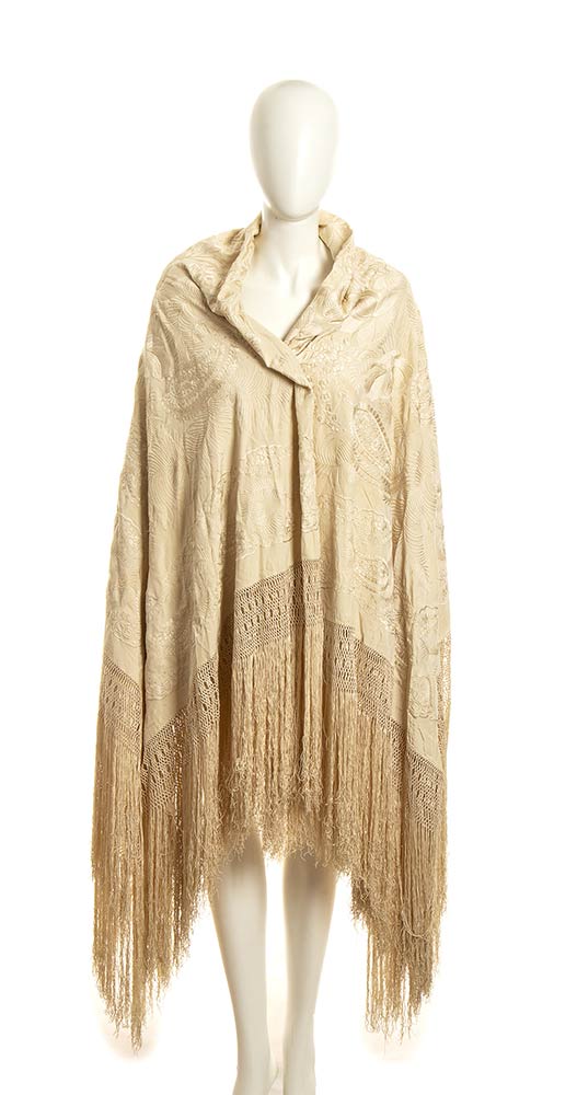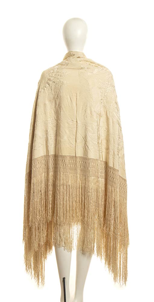 Lotto di 2 grandi scialli ricamati in seta avorio e nera, lunghe frange