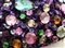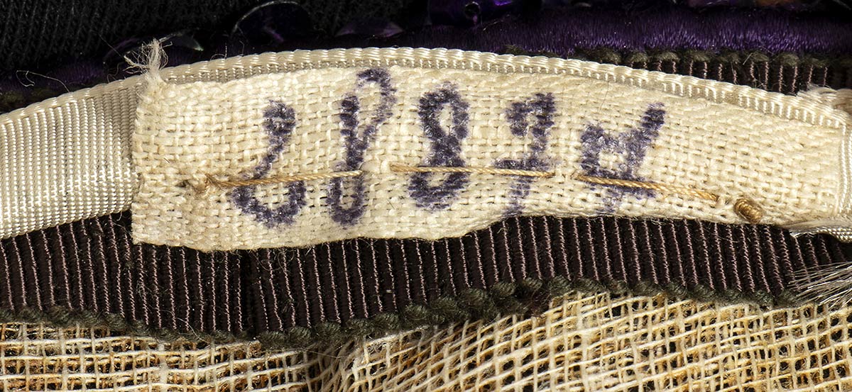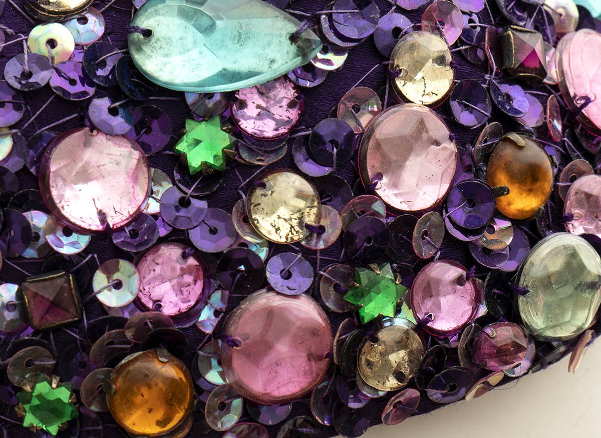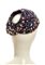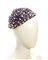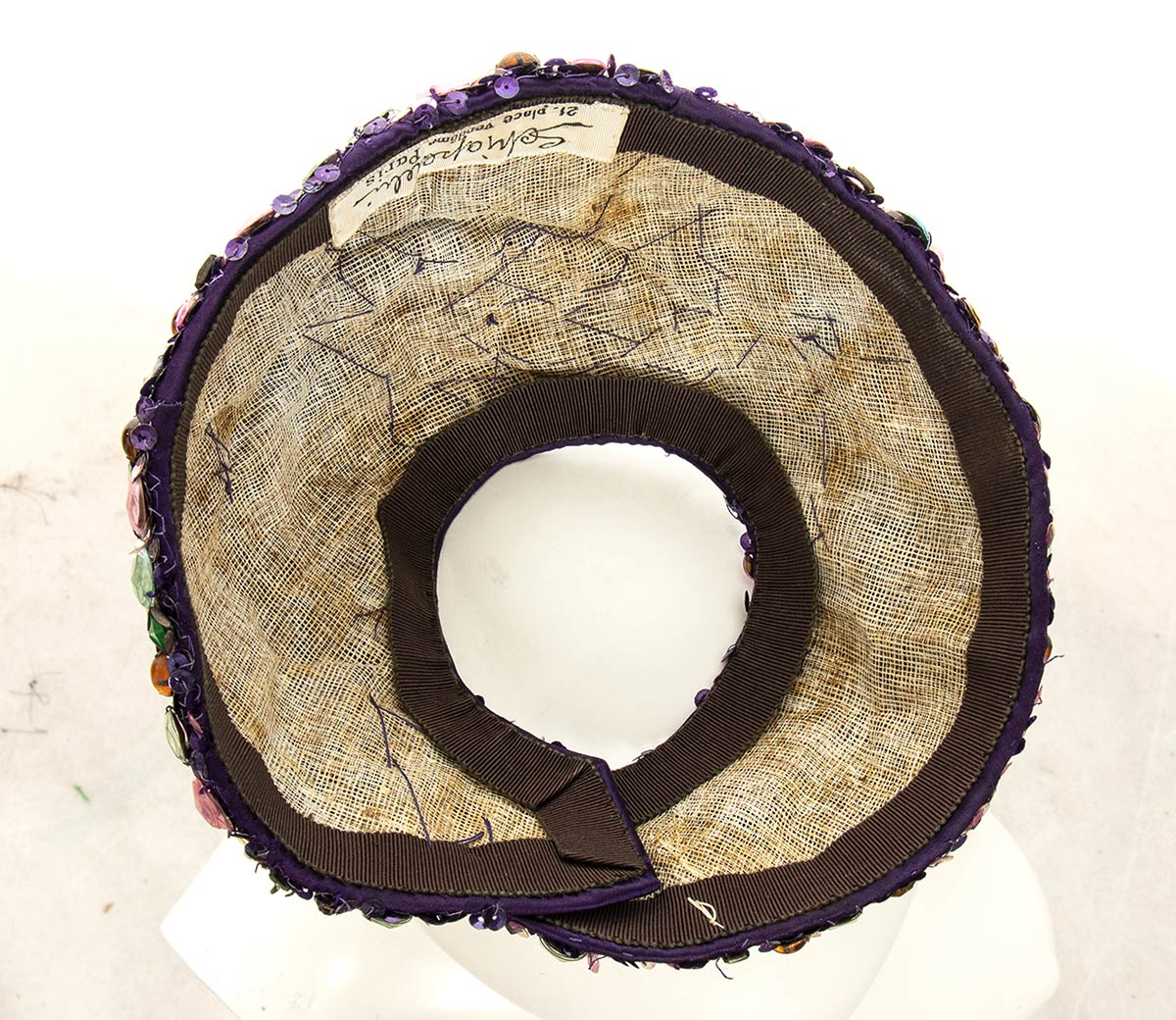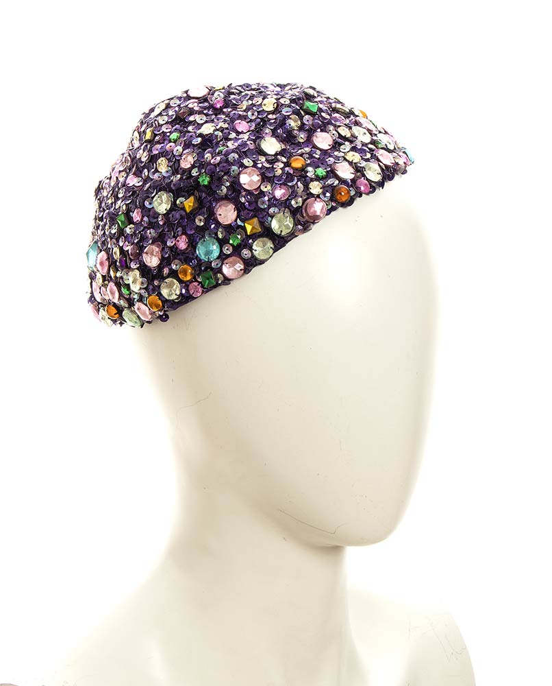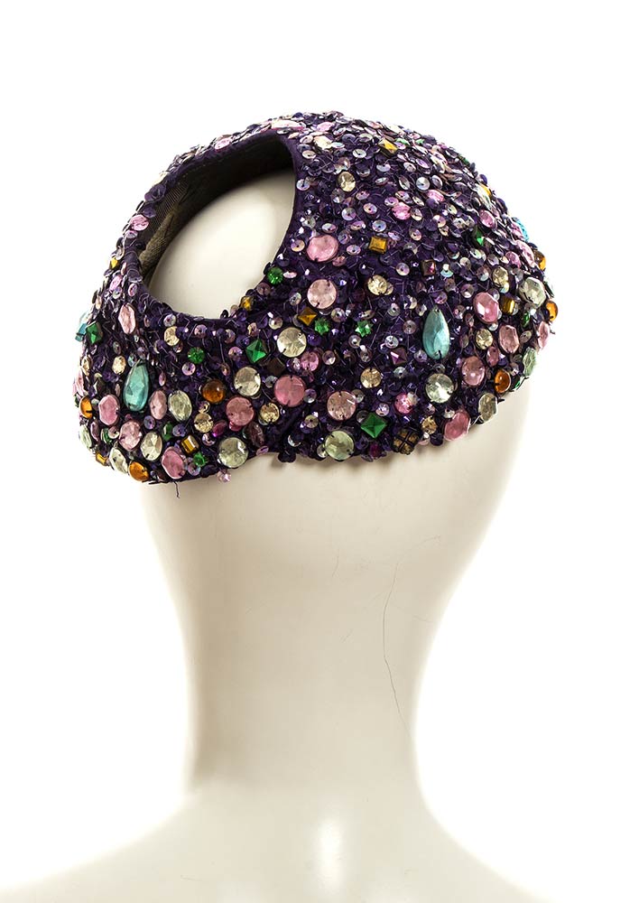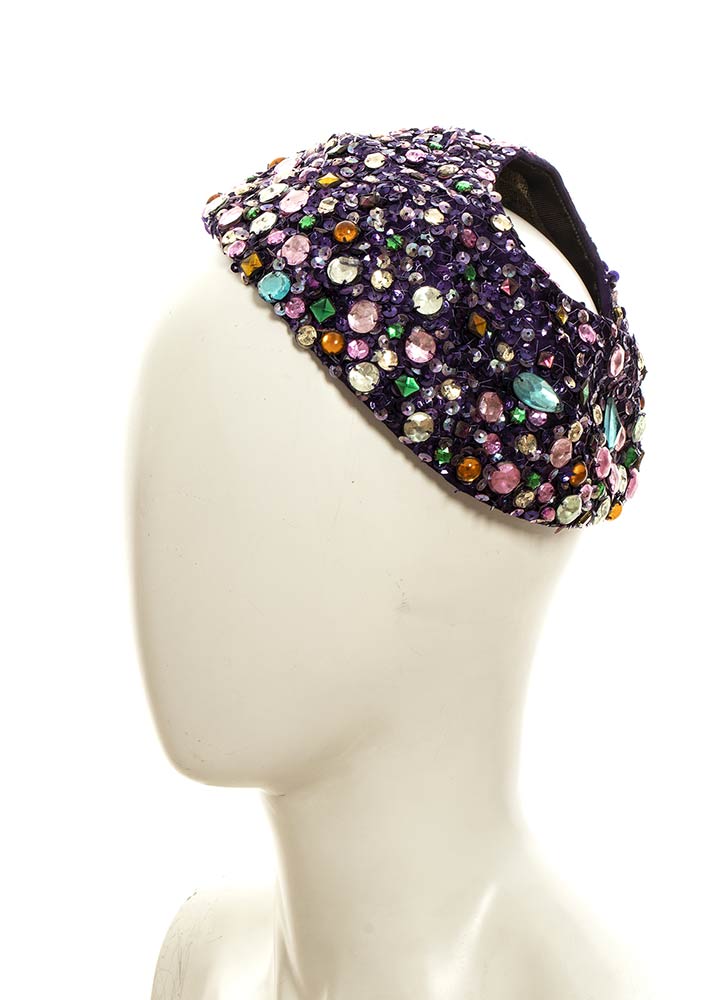 Cappellino da cocktail (couture n° 28877 ) in seta viola ricamato con perline, elementi in plastica di vari colori, paillettes