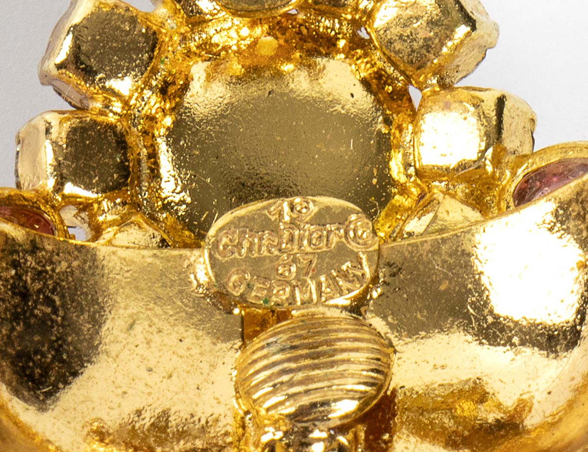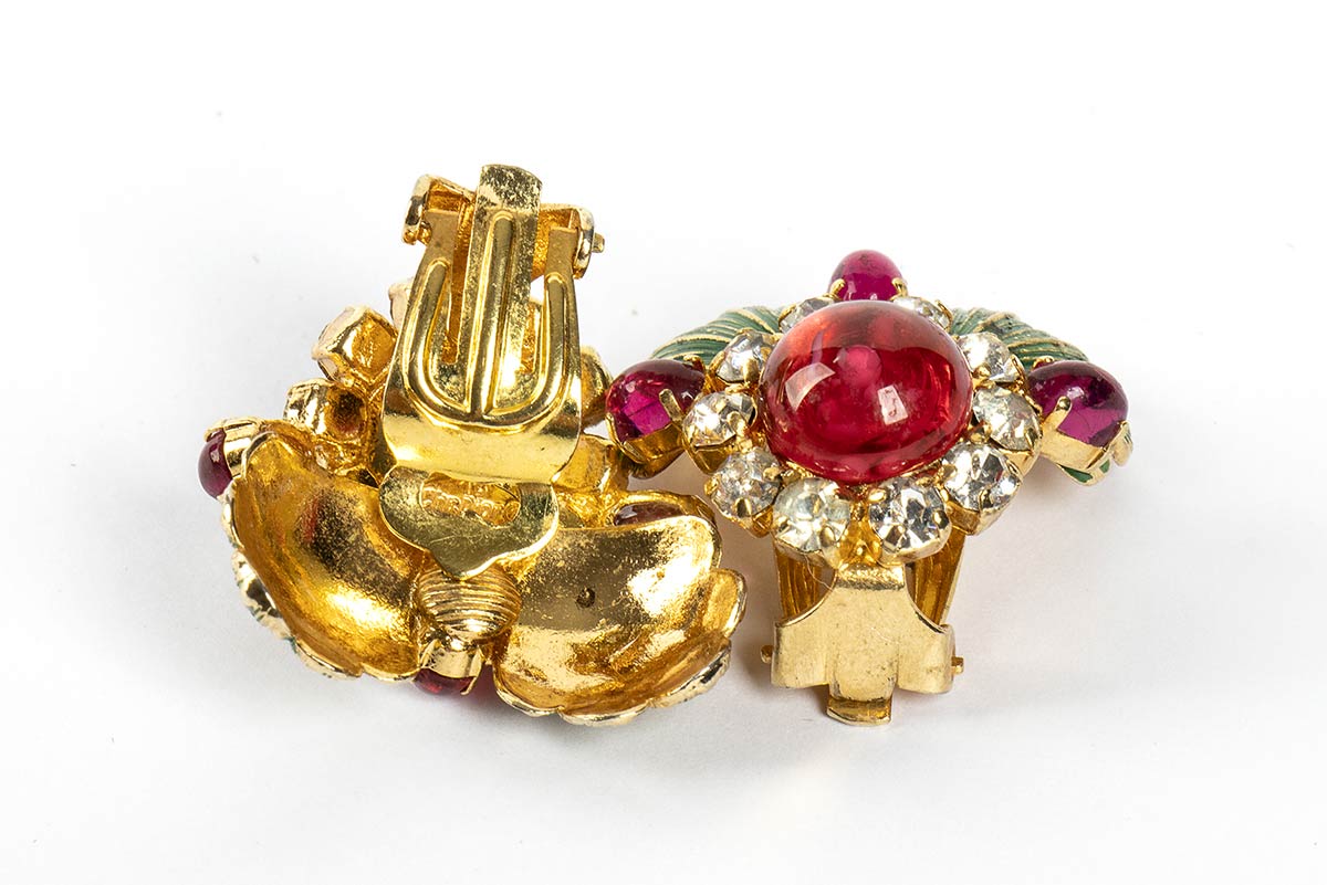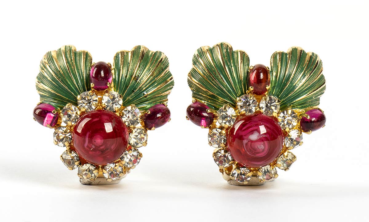 Orecchini con clip in metallo dorato, smalto, paste vitree e strass