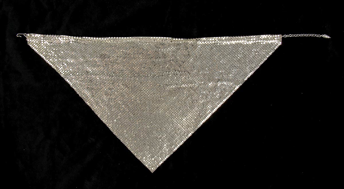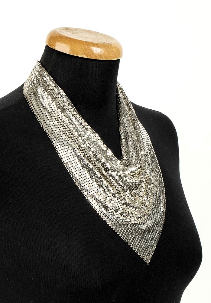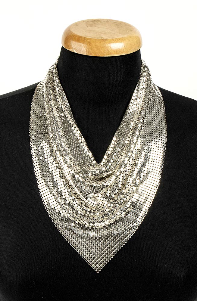 Collana in maglia di metallo argentata, modello a bandana morbido sul collo