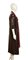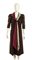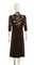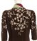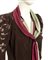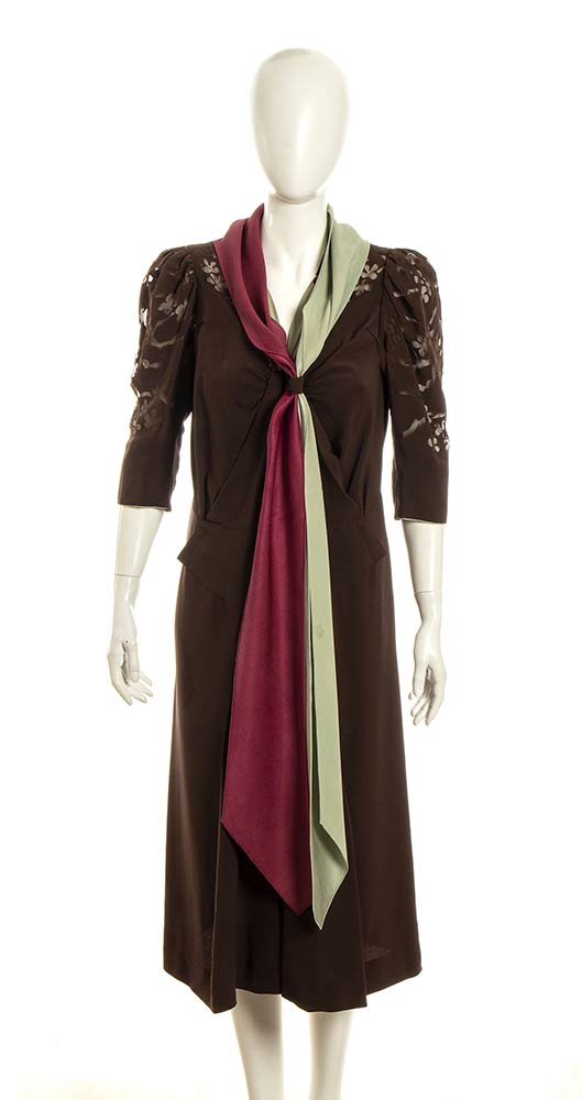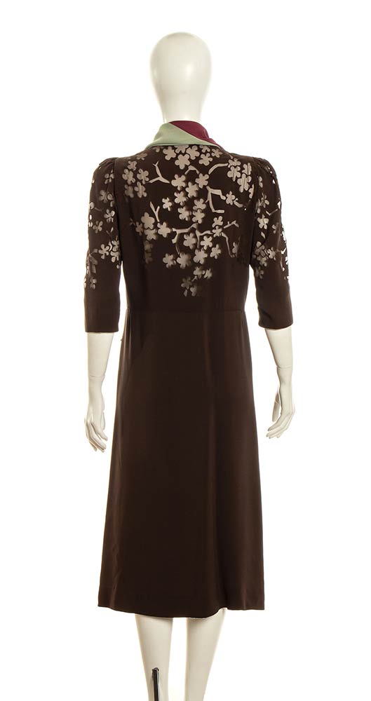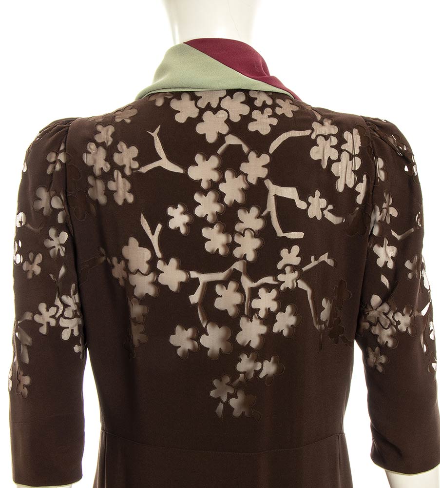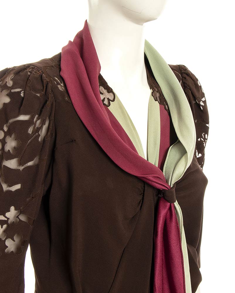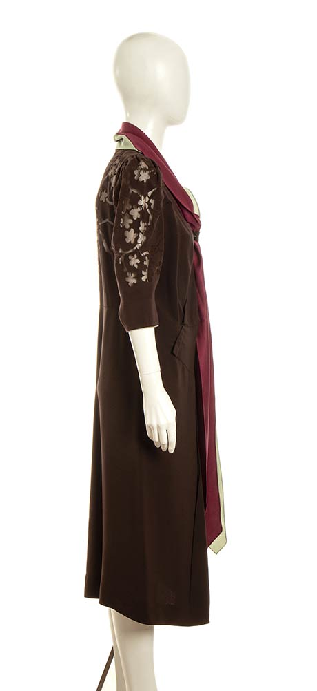 Abito in rayon marrone, dettagli traforati ricoperti da organza marrone, collo con sciarpa staccabile in rayon fucsia e grigio ghiaccio