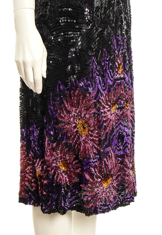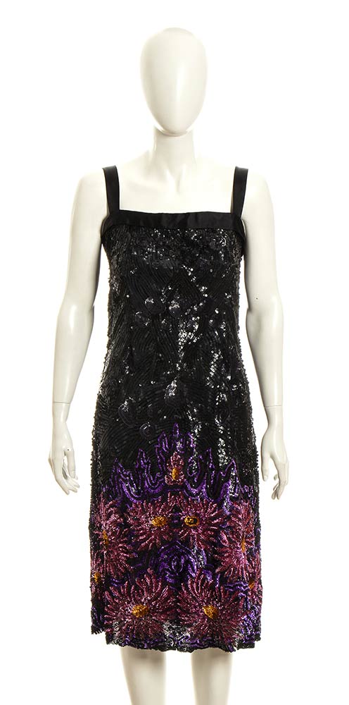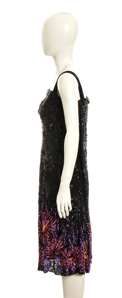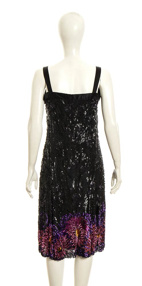 Abito completamente ricamato con paillettes multicolore, profili e spalline in raso nero