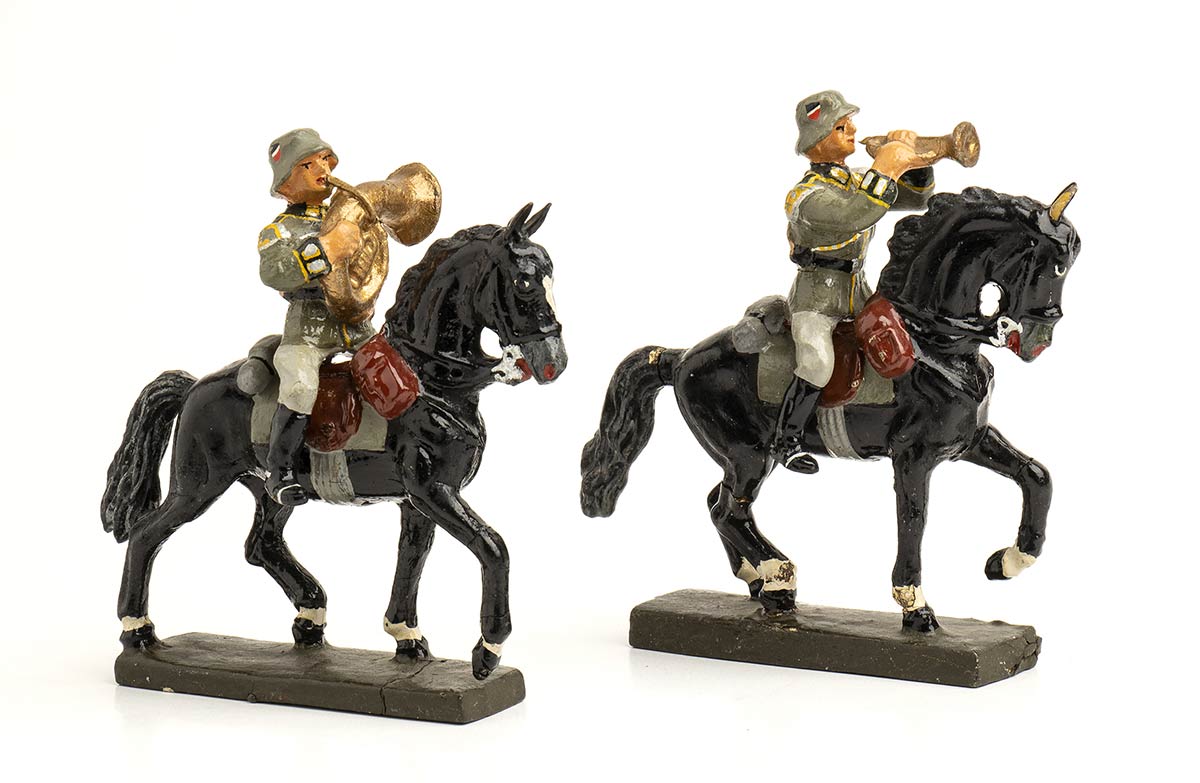 Lotto di 2 soldatini, elementi di banda musicale, a cavallo. Anteguerra, in composizione/pasta. Mancanze ed evidenti tracce d'uso, condizioni discrete. Altezza circa cm.7