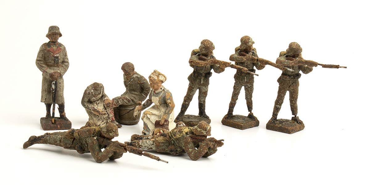 Lotto di 8 soggetti in diverse pose. Anteguerra, in composizione/pasta, con mancanze, rotture ed evidenti tracce d'uso, condizioni mediocri. Altezza soldatini circa cm.7