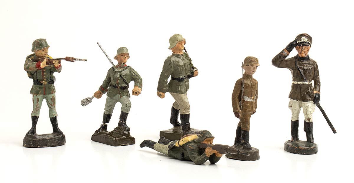 Lotto di 6 soggetti in diverse pose, con ufficiale in tenuta coloniale o da sera, pantaloni bianchi. Anteguerra, in composizione/pasta, con mancanze, rotture ed evidenti tracce d'uso, condizioni mediocri. Altezza soldatini circa cm.7